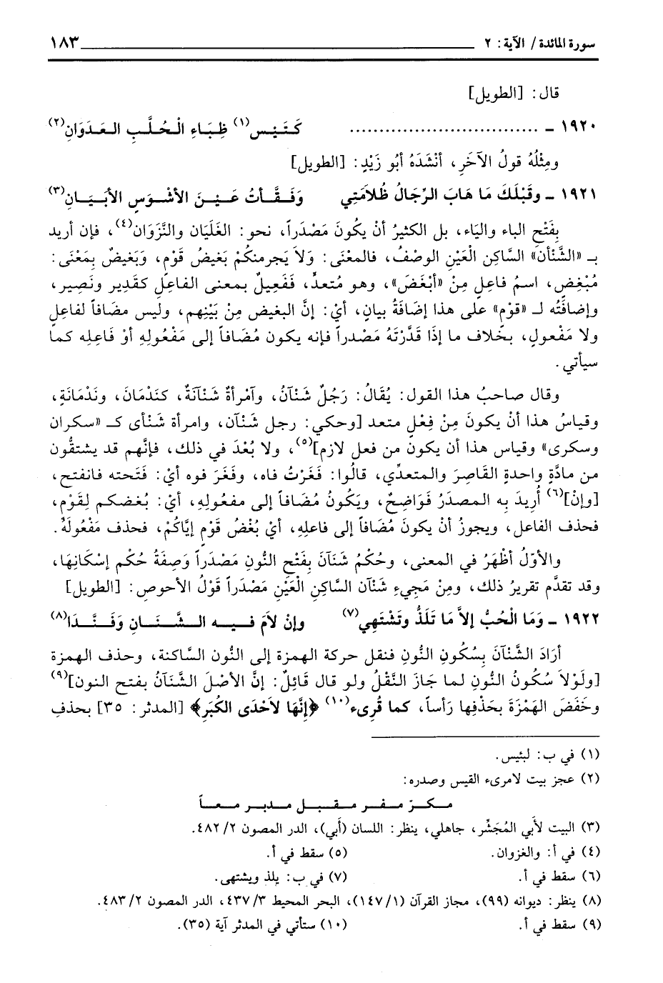 والأوَّلُ أظْهَرُ في المعنى، وحُكْمُ شَنَآنَ بِفَتْحِ النُّونَ مَصْدَراً وَصِفَةُ حُكْم إسْكَانِهَا، وقد تقدَّم تقريرُ ذلك، ومِنْ مَجِيءِ شَنْآن السَّاكِنِ الْعَيْنِ مَصْدَراً قَوْلُ الأحوصِ: [الطويل]