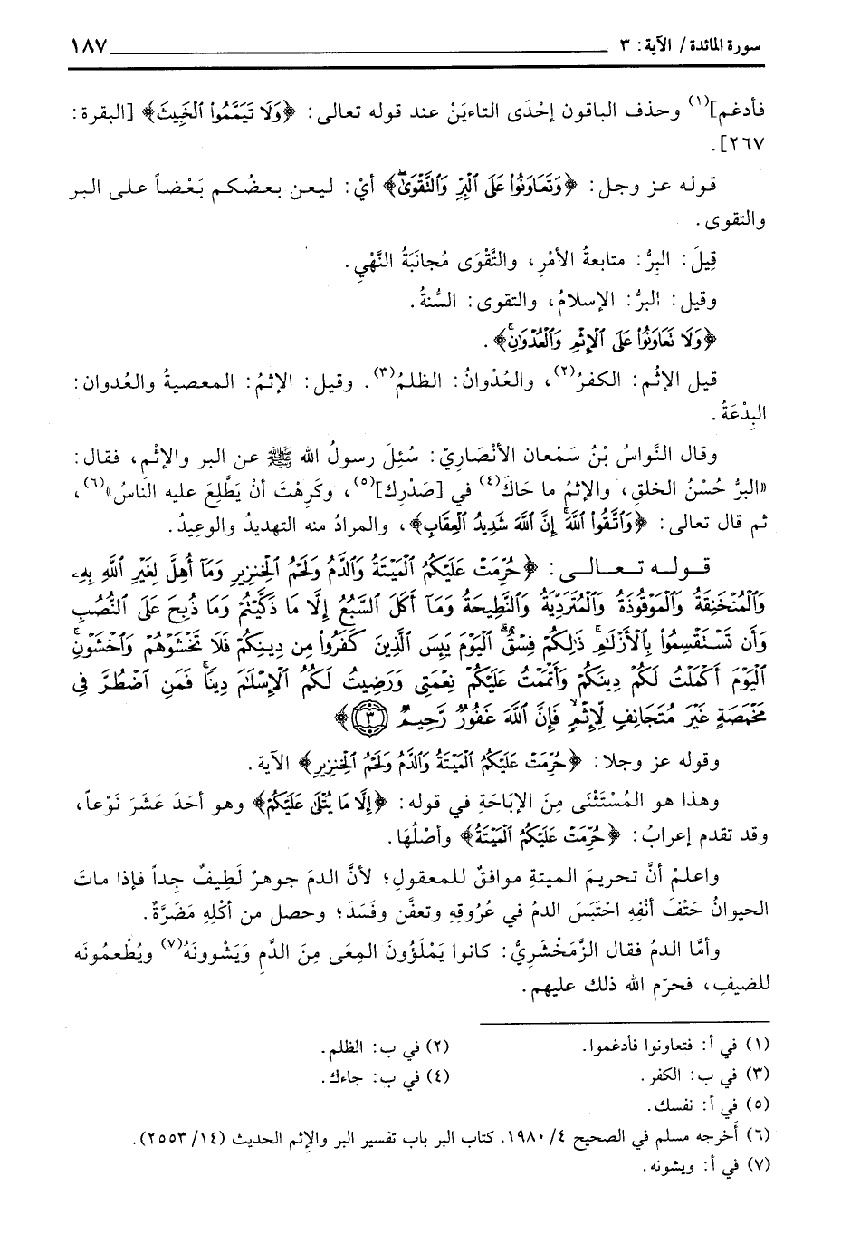 وقال النَّواسُ بْنُ سَمْعان الأنْصَارِيّ: «سُئِلَ رسولُ الله صَلَّى اللَّهُ عَلَيْهِ وَسَلَّم َ عن البر والإثْمِ، فقال:» البرُّ حُسْنُ الخلقِ، والإثمُ ما حَاكَ في [صَدْرِك] ، وكَرِهْتَ أنْ يَطَّلِعَ عليه الناسُ «، ثم قال تعالى: {واتقوا الله إِنَّ الله شَدِيدُ آلْعِقَابِ} ، والمرادُ منه التهديدُ والوعيدُ.