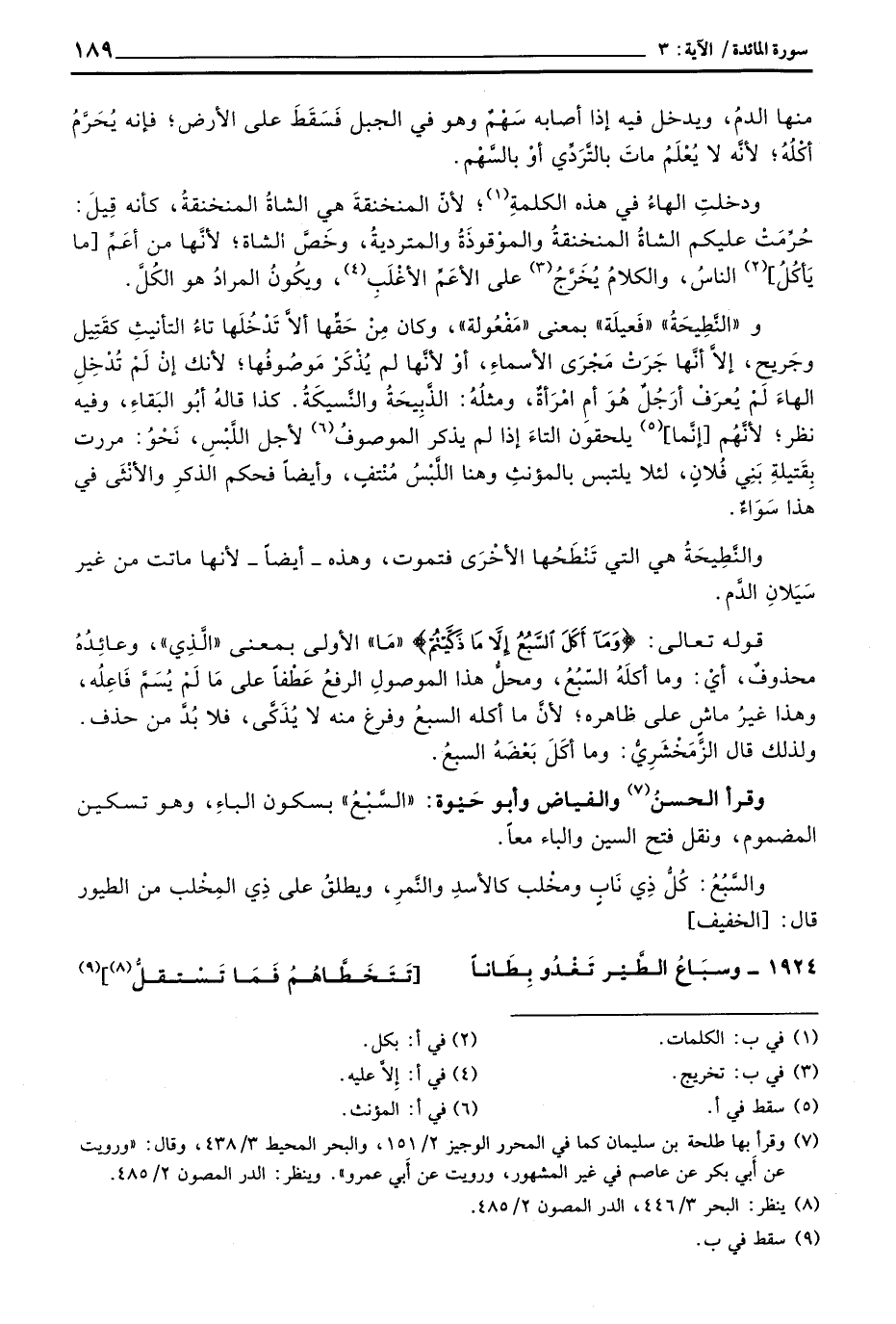 قوله تعالى: {وَمَآ أَكَلَ السبع إِلاَّ مَا ذَكَّيْتُمْ} «مَا» الأولى بمعنى «الَّذِي» ، وعائِدُهُ محذُوفٌ، أيْ: وما أكلَهُ السّبُعُ، ومحلُّ هذا الموصولِ الرفعُ عَطْفاً على مَا لَمْ يُسَمَّ فَاعِلُه، وهذا غيرُ ماشٍ على ظاهره؛ لأنَّ ما أكله السبعُ وفرغ منه لا يُذَكَّى، فلا بُدَّ من حذف. ولذلك قال الزَّمَخْشَرِيُّ: وما أكَلَ بَعْضَهُ السبعُ.