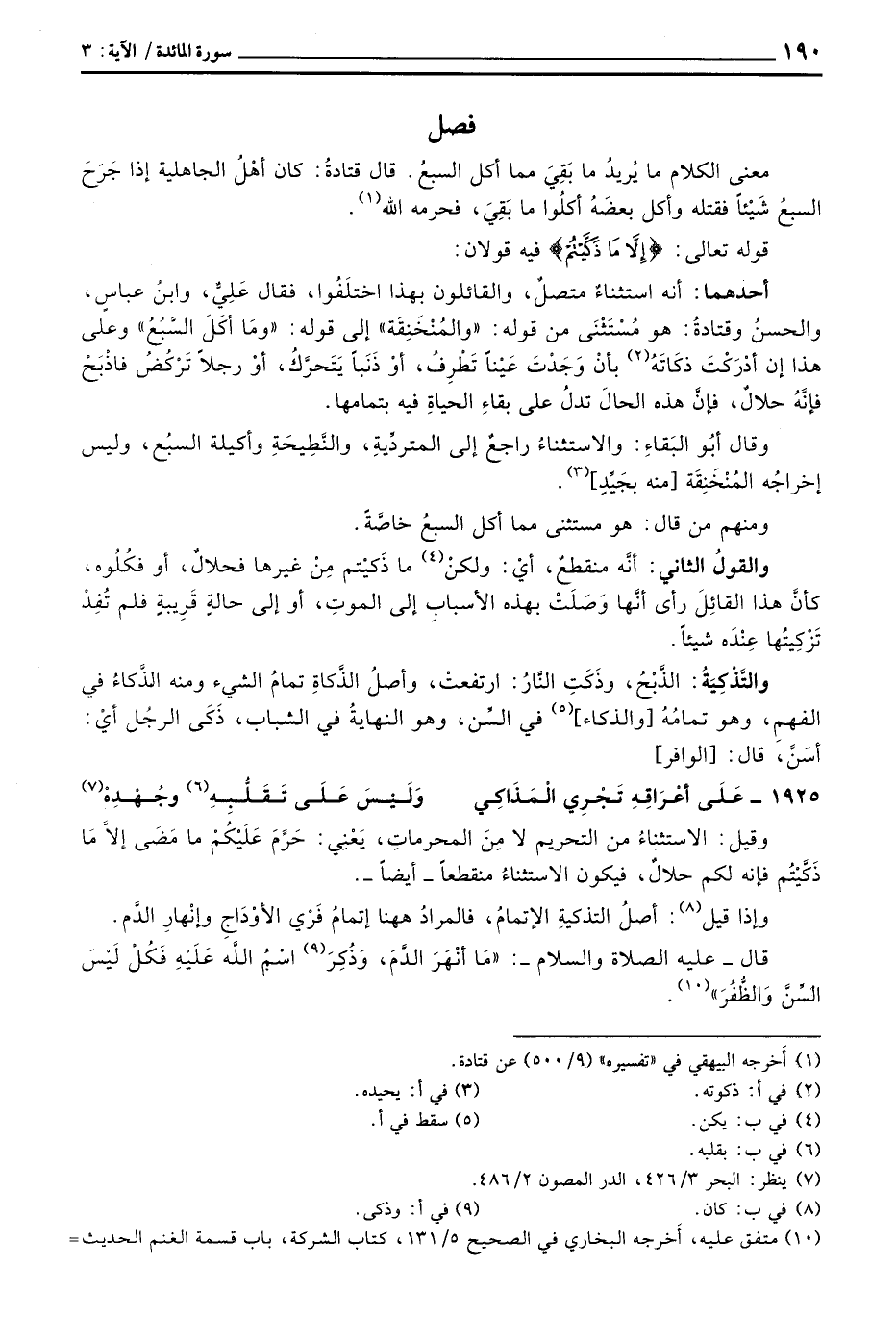 أحدهما: أنه استثناءٌ متصلٌ، والقائلون بهذا اختلَفُوا، فقال عَلِيٌّ، وابنُ عباسٍ، والحسنُ وقتادةُ: هو مُسْتَثْنَى من قوله: «والمُنْخَنِقَة» إلى قوله: {وَمَآ أَكَلَ السبع} وعلى هذا إن أدْرَكْتَ ذكَاتَهُ بأنْ وَجَدْتَ عَيْناً تَطْرِفُ، أوْ ذَنَباً يَتَحرَّكُ، أوْ رجلاً تَرْكُضُ فاذْبَحْ فإنَّهُ حلالٌ، فإنَّ هذه الحالَ تدلُ على بقاءِ الحياةِ فيه بتمامها.