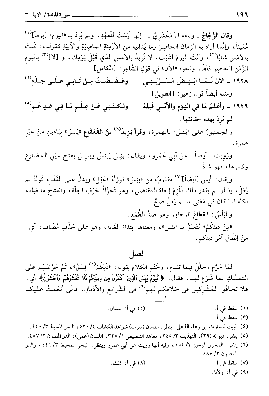 وقال الزَّجَّاجُ - وتبعه الزَّمَخْشَرِيُّ -: إنَّها لَيْسَتْ للْعَهْدِ، ولم يُرِدْ ب «اليوم» [يوماً] مُعَيَّناً، وإنَّما أراد به الزمانَ الحاضِرَ وما يُدانيه من الأزْمِنَةِ الماضِيَةِ والآتِيَةِ كقولك: كُنْتَ بالأمْس شابًّا، وأنْتَ اليومَ أشْيَب، لا تُرِيدُ بالأمسِ الذي قَبْلَ يَوْمِك، و [لا] باليومِ الزَّمَن الحاضِر فَقَطْ، ونحوه «الآن» في قَوْلِ الشَّاعِرِ: [الكامل]