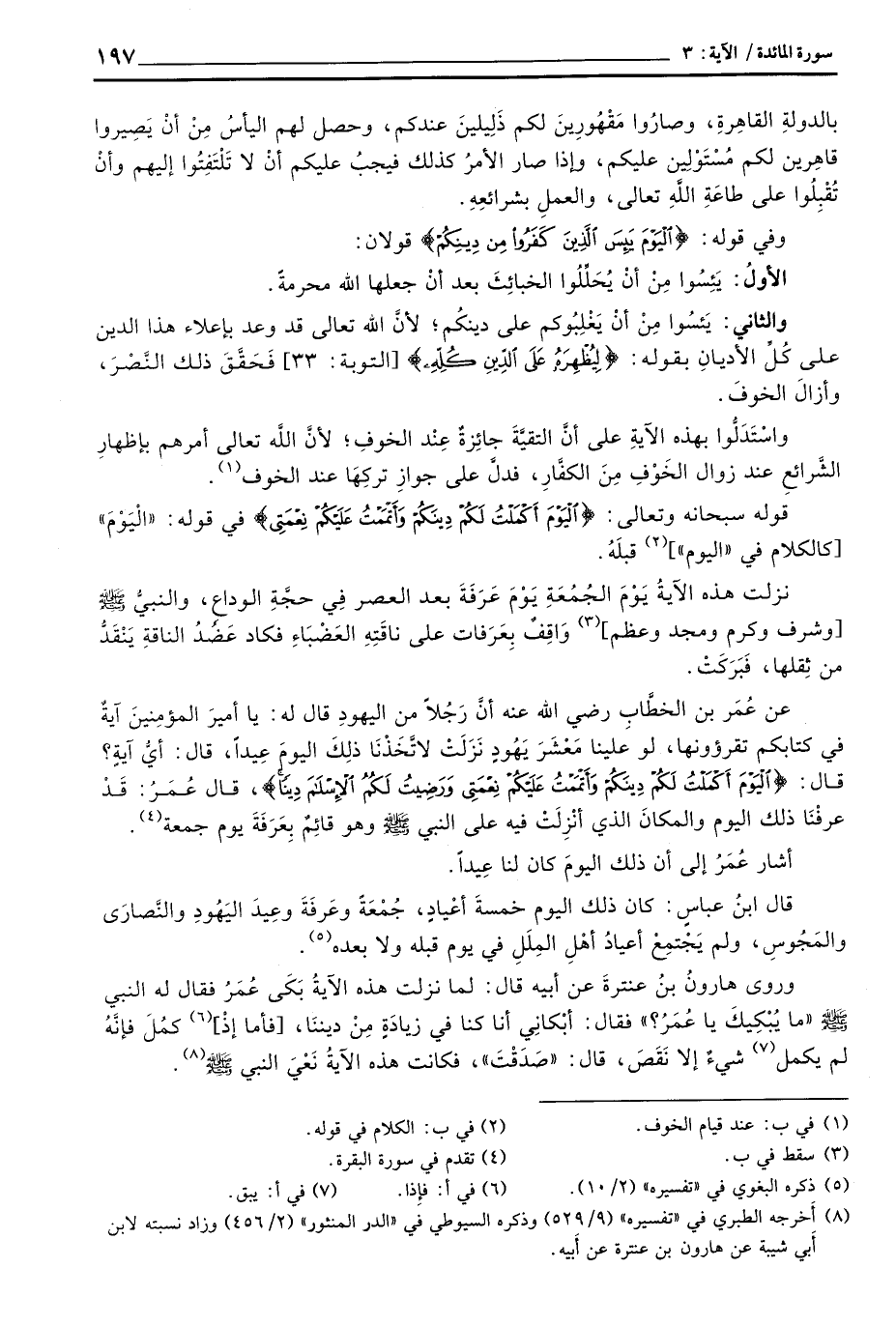 عن عُمَر بن الخطَّابِ رَضِيَ اللَّهُ عَنْه أنَّ رَجُلاً من اليهودِ قال له: يا أميرَ المؤمِنينَ آيةٌ في كتابكم تقرؤونها، لو علينا مَعْشَرَ يَهُودٍ نَزَلَتْ لاتَّخَذْنَا ذلِكَ اليومَ عِيداً، قال: أيُّ آيةٍ؟ قال: {اليوم أَكْمَلْتُ لَكُمْ دِينَكُمْ وَأَتْمَمْتُ عَلَيْكُمْ نِعْمَتِي وَرَضِيتُ لَكُمُ الأسلام دِيناً} قال عُمَرُ: قَدْ عرفْنَا ذلك اليوم والمكانَ الذي أنْزِلَتْ فيه على النبي صَلَّى اللَّهُ عَلَيْهِ وَسَلَّم َ وهو قائِمٌ بِعَرَفَةَ يوم جمعة.