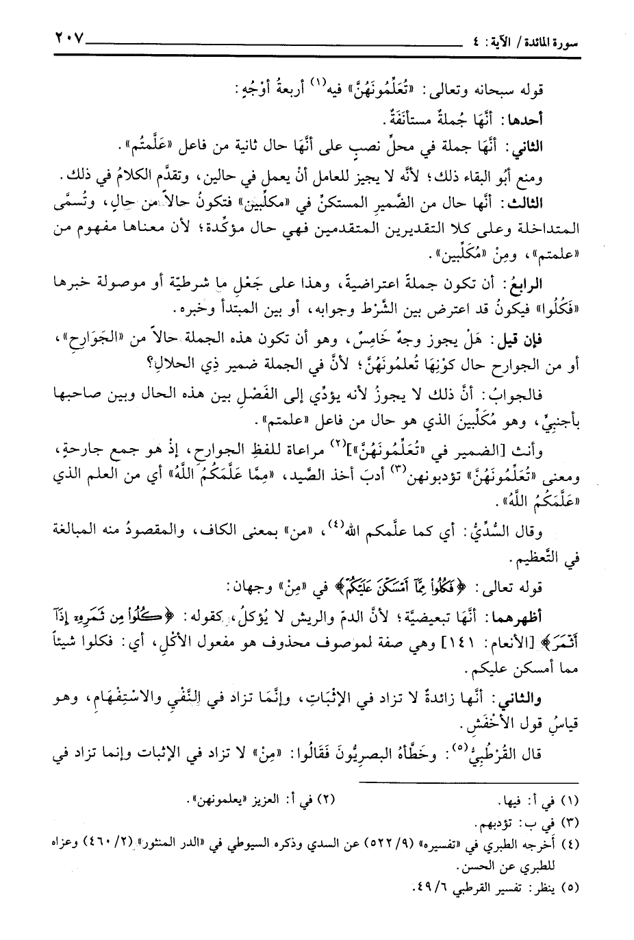 فإن قيل: هَلْ يجوز وجهٌ خَامِسٌ، وهو أن تكون هذه الجملة حالاً من «الجَوَارِحِ» ، أو من الجوارح حال كوْنِهَا تُعلمُونَهُنَّ؛ لأنَّ في الجملة ضمير ذِي الحلالِ؟