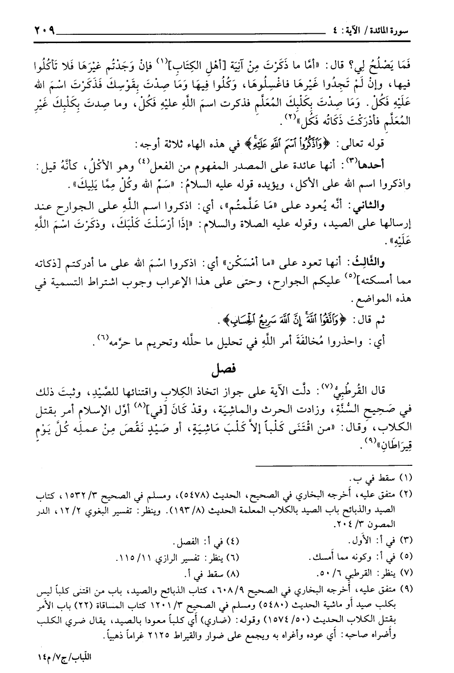 والثاني: أنه يعود على " ما علمتم "، أي: اذكروا اسم الله على الجوارح عند إرسالها على الصيد، وقوله عليه الصلاة والسلام: " إذا أرسلت كلبك، وذكرت اسم الله عليه ".