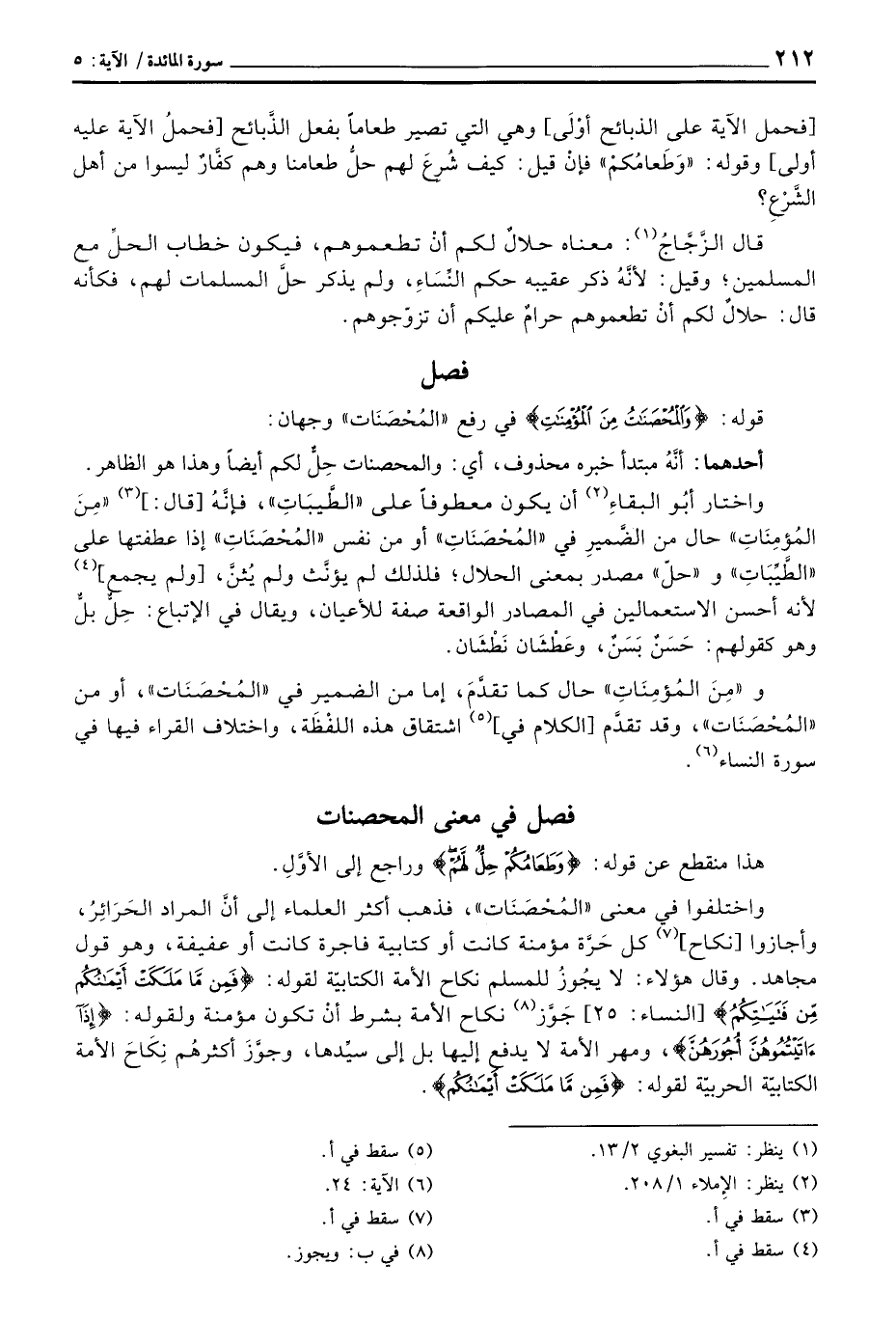 واختلفوا في معنى «المُحْصَنَات» ، فذهب أكثر العلماء إلى أنَّ المراد الحَرَائِرُ، وأجازوا [نكاح] كل حَرَّة مؤمنة كانت أو كتابية فاجرة كانت أو عفيفة، وهو قول مجاهد. وقال هؤلاء: لا يجُوزُ للمسلم نكاح الأمة الكتابيّة لقوله: {فَمِنْ مَّا مَلَكَتْ أَيْمَانُكُم مِّن فَتَيَاتِكُمُ} [النساء: 25] جَوَّز نكاح الأمة بشرط أنْ تكون مؤمنة ولقوله: {إِذَآ آتَيْتُمُوهُنَّ أُجُورَهُنَّ} ، ومهر الأمة لا يدفع إليها بل إلى سيِّدها، وجوَّزَ أكثرهُم نِكَاحَ الأمة الكتابيّة الحربيّة لقوله: {فَمِنْ مَّا مَلَكَتْ أَيْمَانُكُم} [النساء: 25] .