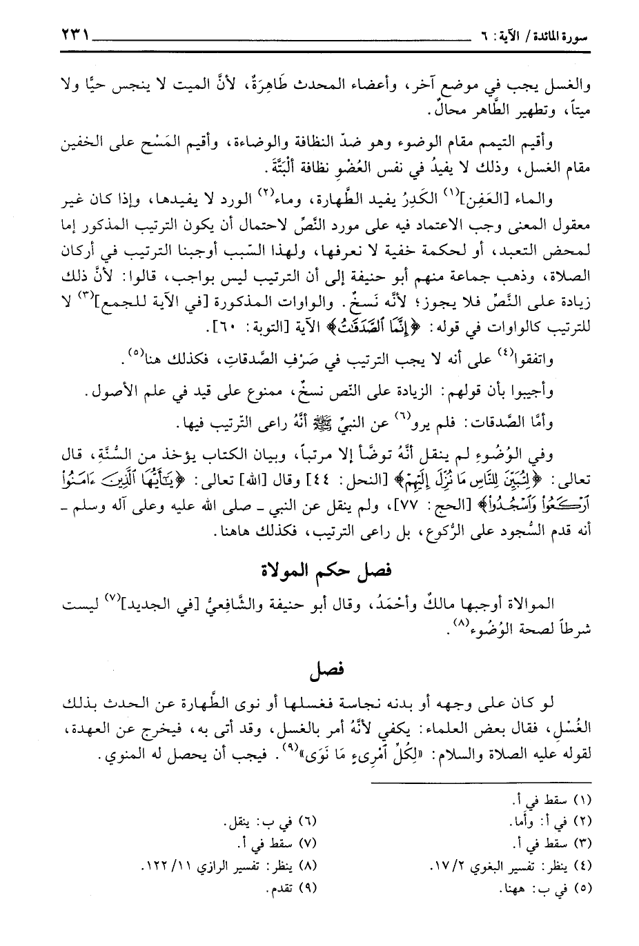 والماء [العَفِن] الكَدِرُ يفيد الطَّهارة، وماء الورد لا يفيدها، وإذا كان غير معقول المعنى وجب الاعتماد فيه على مورد النَّصِّ لاحتمال أن يكون الترتيب المذكور إما لمحض التعبد، أو لحكمة خفية لا نعرفها، ولهذا السّبب أوجبنا الترتيب في أركان الصلاة، وذهب جماعة منهم أبو حنيفة إلى أن الترتيب ليس بواجب، قالوا: لأنَّ ذلك زيادة على النَّصِّ فلا يجوز؛ لأنَّه نَسخٌ. والواوات المذكورة [في الآية للجمع] لا للترتيب كالواوات في قوله: