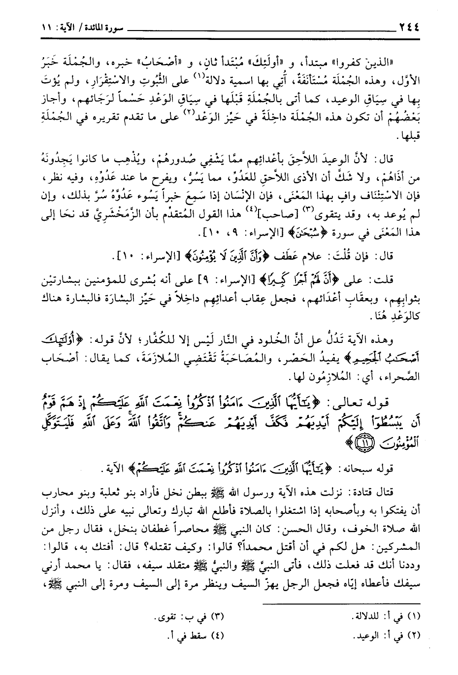 قتال قتادة: نزلت هذه الآية ورسول الله صَلَّى اللَّهُ عَلَيْهِ وَسَلَّم َ ببطن نخل فأراد بنو ثعلبة وبنو محارب أن يفتكوا به وبأصحابه إذا اشتغلوا بالصلاة فأطلع الله تبارك وتعالى نبيه على ذلك، وأنزل الله صلاة الخوف، وقال الحسن: كان النبي صَلَّى اللَّهُ عَلَيْهِ وَسَلَّم َ محاصراً غطفان بنخل، فقال رجل من المشركين: هل لكم في أن أقتل محمداً؟ قالوا: وكيف تقتله؟ قال: أفتك به، قالوا: وددنا أنك قد فعلت ذلك، فأتى النبيَّ صَلَّى اللَّهُ عَلَيْهِ وَسَلَّم َ والنبيُّ صَلَّى اللَّهُ عَلَيْهِ وَسَلَّم َ متقلد سيفه، فقال: يا محمد أرني سيفك فأعطاه إيّاه فجعل الرجل يهزّ السيف وينظر مرة إلى السيف ومرة إلى النبي صَلَّى اللَّهُ عَلَيْهِ وَسَلَّم َ،