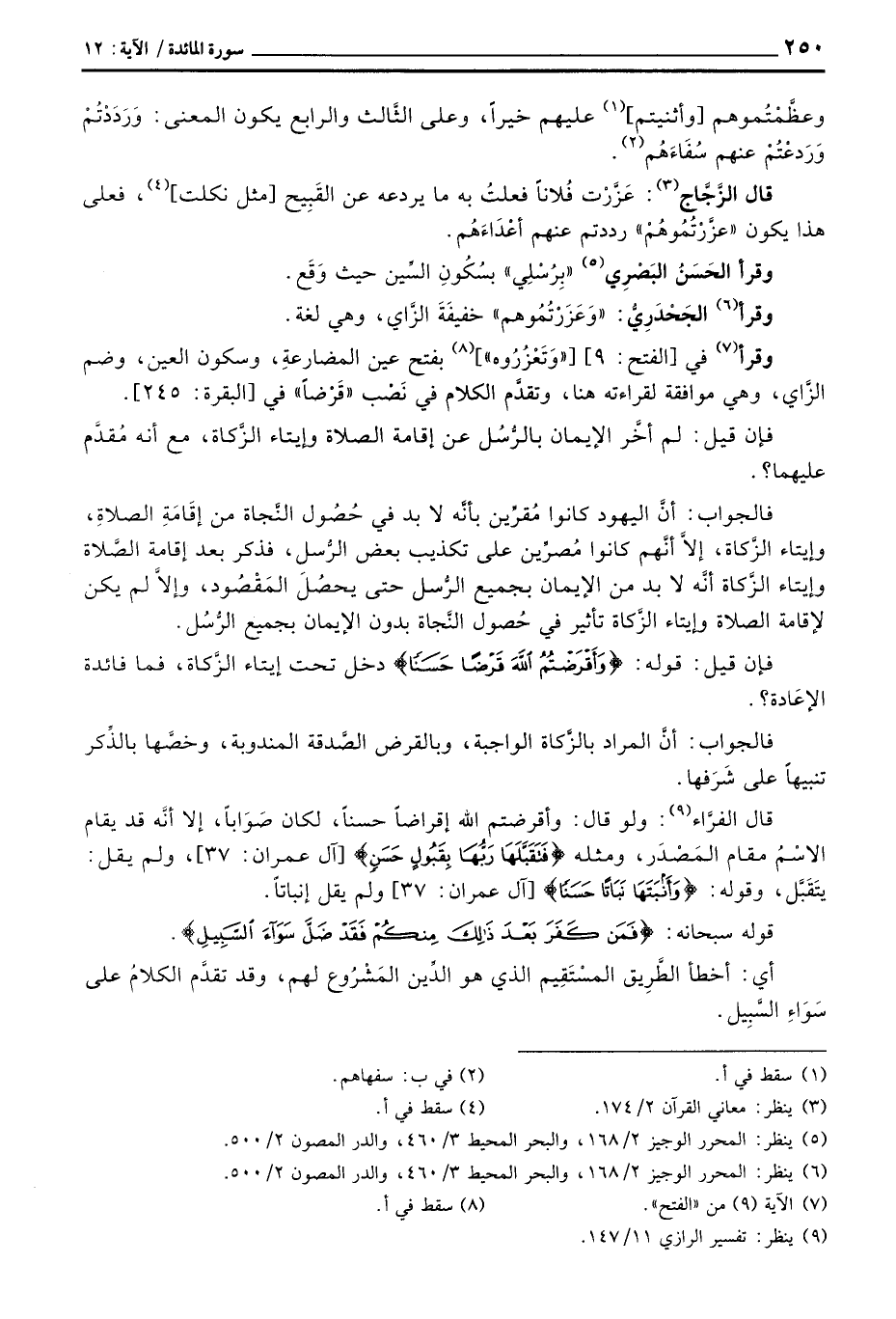 وقرأ في [الفتح: 9] [ «وَتَعْزُرُوه» ] بفتح عين المضارعةِ، وسكون العين، وضم الزَّاي، وهي موافقة لقراءته هنا، وتقدَّم الكلام في نَصْب «قَرْضاً» في [البقرة: 245] .