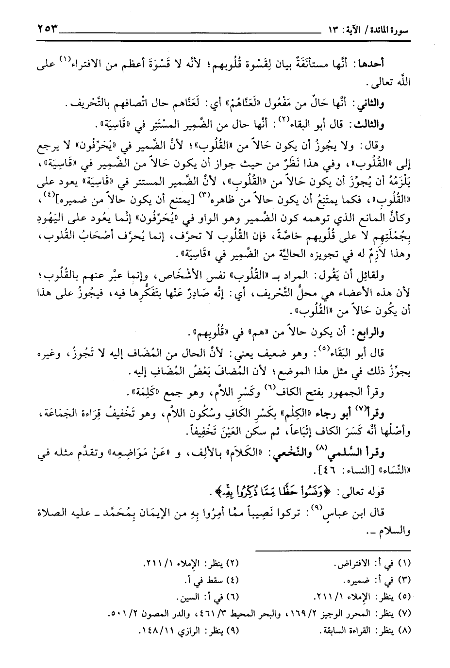 وقال: ولا يجُوزُ أن يكون حَالاً من «القُلُوب» ؛ لأنَّ الضَّمير في «يُحَرِّفُون» لا يرجع إلى «القُلُوب» ، وفي هذا نَظَرٌ من حيث جواز أن يكون حَالاً من الضَّمِير في «قَاسِيَة» ، يَلزَمُهُ أن يُجوِّزَ أن يكون حَالاً من «القُلُوبِ» ، لأنَّ الضَّمير المستتر في «قَاسِيَة» يعود على «القُلُوبِ» ، فكما يمتَنِعُ أن يكون حالاً من ظاهره [يمتنع أن يكون حالاً من ضميره] ، وكأنَّ المانع الذي توهمه كون الضَّمير وهو الواو في «يُحَرِّفُون» إنَّما يعُود على اليَهُودِ بِجُمْلَتِهِم لا على قُلُوبهم خاصَّةً، فإن القُلُوب لا تحرَّف، إنما يُحرَّف أصْحَابُ القُلوب، وهذا لازِمٌ له في تجويزه الحالِيَّة من الضَّمِير في «قَاسِيَة» .
