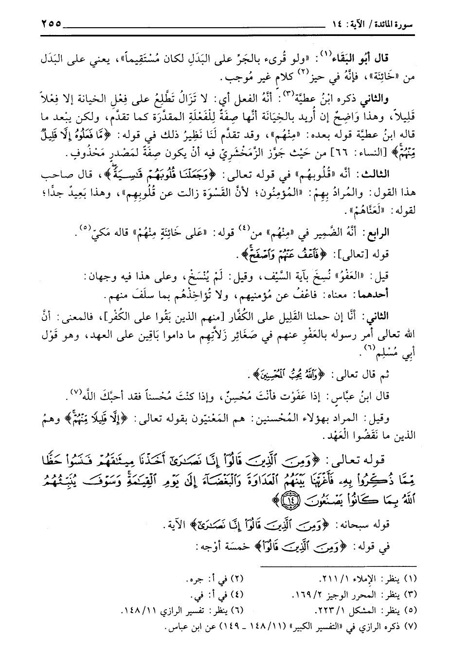 الثاني: أنَّا إن حملنا القَلِيل على الكُفَّار [منهم الذين بَقُوا على الكُفْر] ، فالمعنى: أنَّ الله تعالى أمر رسوله بالعَفْوِ عنهم في صَغَائِر زَلاَّتِهِم ما داموا بَاقِين على العهد، وهو قَوْل أبِي مُسْلِم.