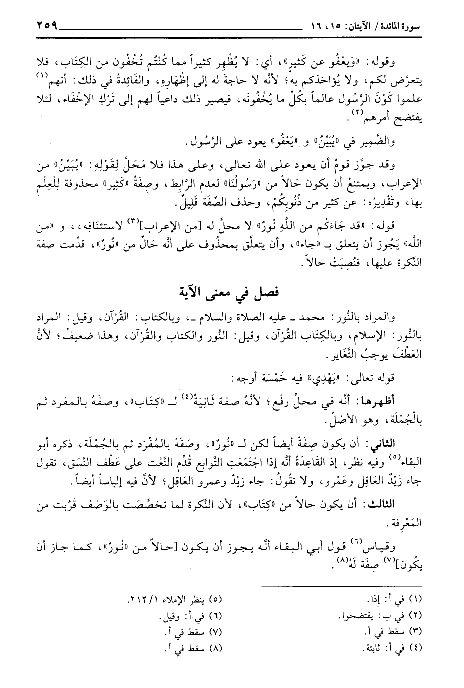 وقد جوَّز قومٌ أن يعود على الله تعالى، وعلى هذا فلا مَحَلَّ لِقَوْلِهِ:» يُبَيِّنُ «من الإعراب، ويمتنعُ أن يكون حَالاً من» رَسُولُنَا «لعدم الرَّابِط، وصِفَةُ» كَثِير «محذوفة لِلْعِلْمِ بها، وتَقْدِيرُه: عن كثير من ذُنُوبِكُمْ، وحذف الصِّفَة قَلِيلٌ.