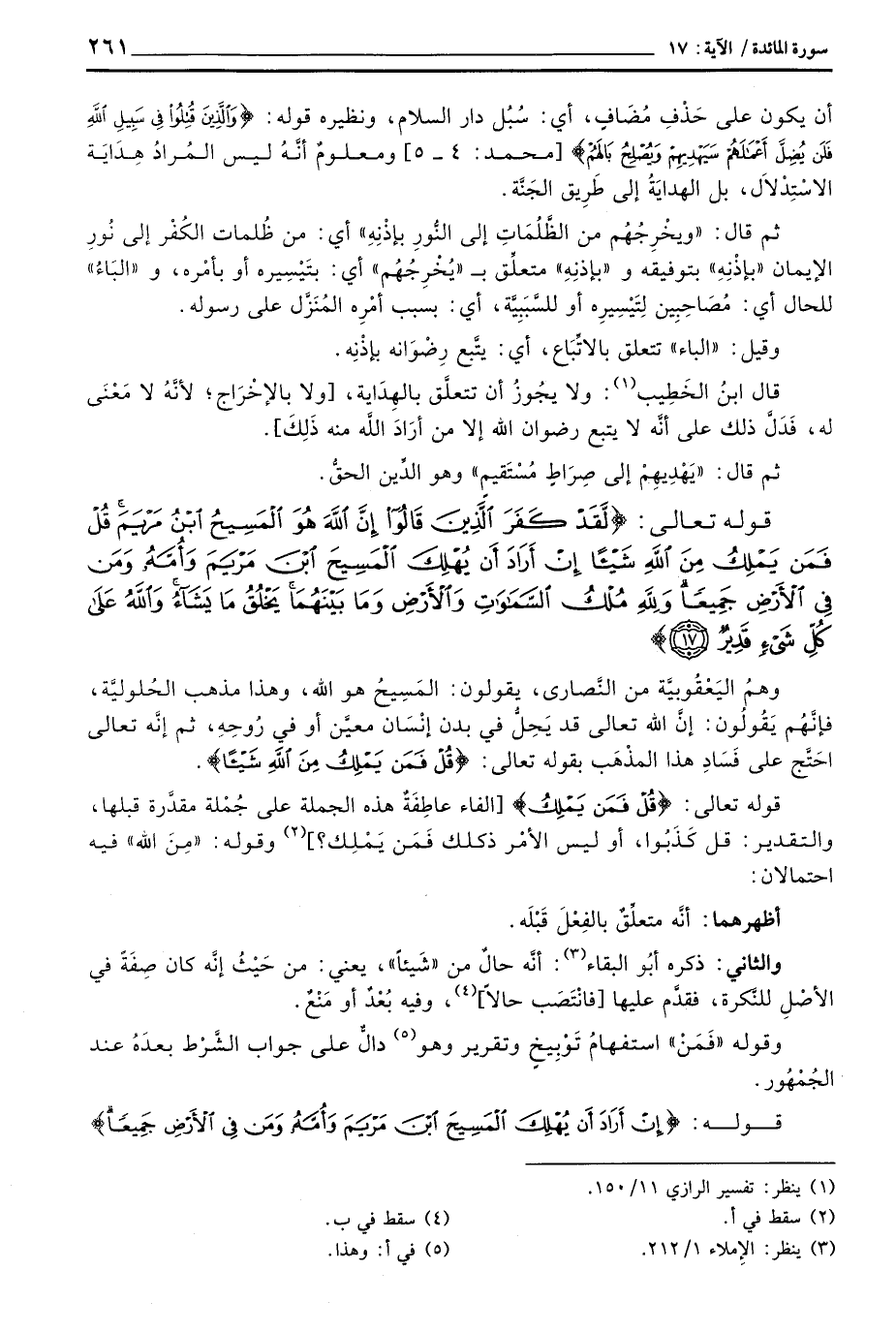 قال ابنُ الخَطِيب: ولا يجُوزُ أن تتعلَّق بالهِدَاية، [ولا بالإخْرَاج؛ لأنَّه لا مَعْنَى له، فَدَلَّ ذلك على أنَّه لا يتبع رضوان الله إلا من أرَادَ اللَّه منه ذَلِكَ] .