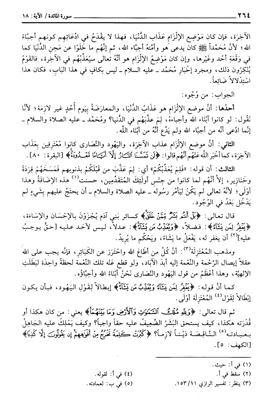 قال تعالى: {بَلْ أَنتُمْ بَشَرٌ مِمَّنْ خَلَقَ} كسائر بَنِي آدَم يُجْزَوْنَ بالإحْسَان والإسَاءَة، {يَغْفِرُ لِمَن يَشَآءُ} : فضلاً، {وَيُعَذِّبُ مَن يَشَآءُ} : عدلاً، ليس لأحَد عليه [حقٌّ يوجبُ عليه] أن يغفر له، يَفْعَلُ ما يَشَاءُ، ويَحْكُم ما يُرِيدُ.