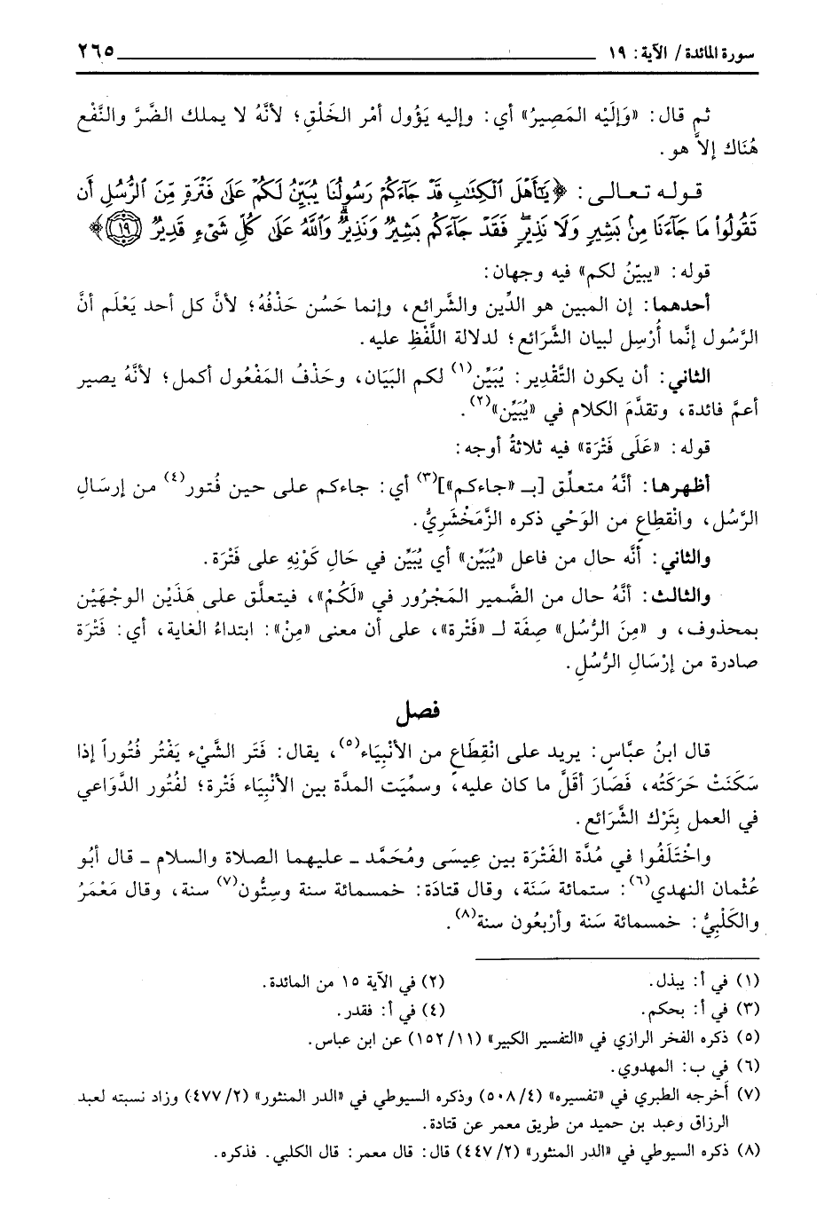 قال ابنُ عبَّاسٍ: يريد على انْقِطَاعٍ من الأنْبِيَاء، يقال: فَتَر الشَّيْ يَفْتُر فُتُوراً إذا سَكَنَتْ حَرَكَتُه، فَصَارَ أقَلَّ ما كان عليه، وسمِّيَت المدَّة بين الأنْبِيَاء فَتْرة؛ لفُتُور الدَّوَاعي في العمل بِتَرْك الشَّرَائع.