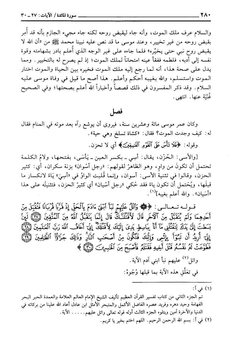 وَالسَّلَام ُ عرف ملك الموت، وأنه جاء ليقبض روحه لكنه جاء مجيء الجازم بأنه قد أُمِر بقبض روحه من غير تخيير، وعند موسى ما قد نص عليه نبينا محمد صَلَّى اللَّهُ عَلَيْهِ وَسَلَّم َ من «أن الله لا يقبض روح نبي حتى يخيِّره» فلما جاءه على غير الوجه الذي أُعلم بادر بشهامته وقوة نفسه إلى أدبه، فلطمه ففقأ عينه امتحاناً لملك الموت؛ إذ لم يصرح له بالتخيير. ومما يدل على صحة هذا، أنه لما رجع إليه ملك الموت فخيره بين الحياة والموت اختار الموت واستسلم، والله بغيبه أحكم وأعلم. هذا أصح ما قيل في وفاة موسى عليه السلام. وقد ذكر المفسرون في ذلك قصصاً وأخباراً الله أعلم بصحتها؛ وفي الصحيح غُنْيَة عنها. انتهى.