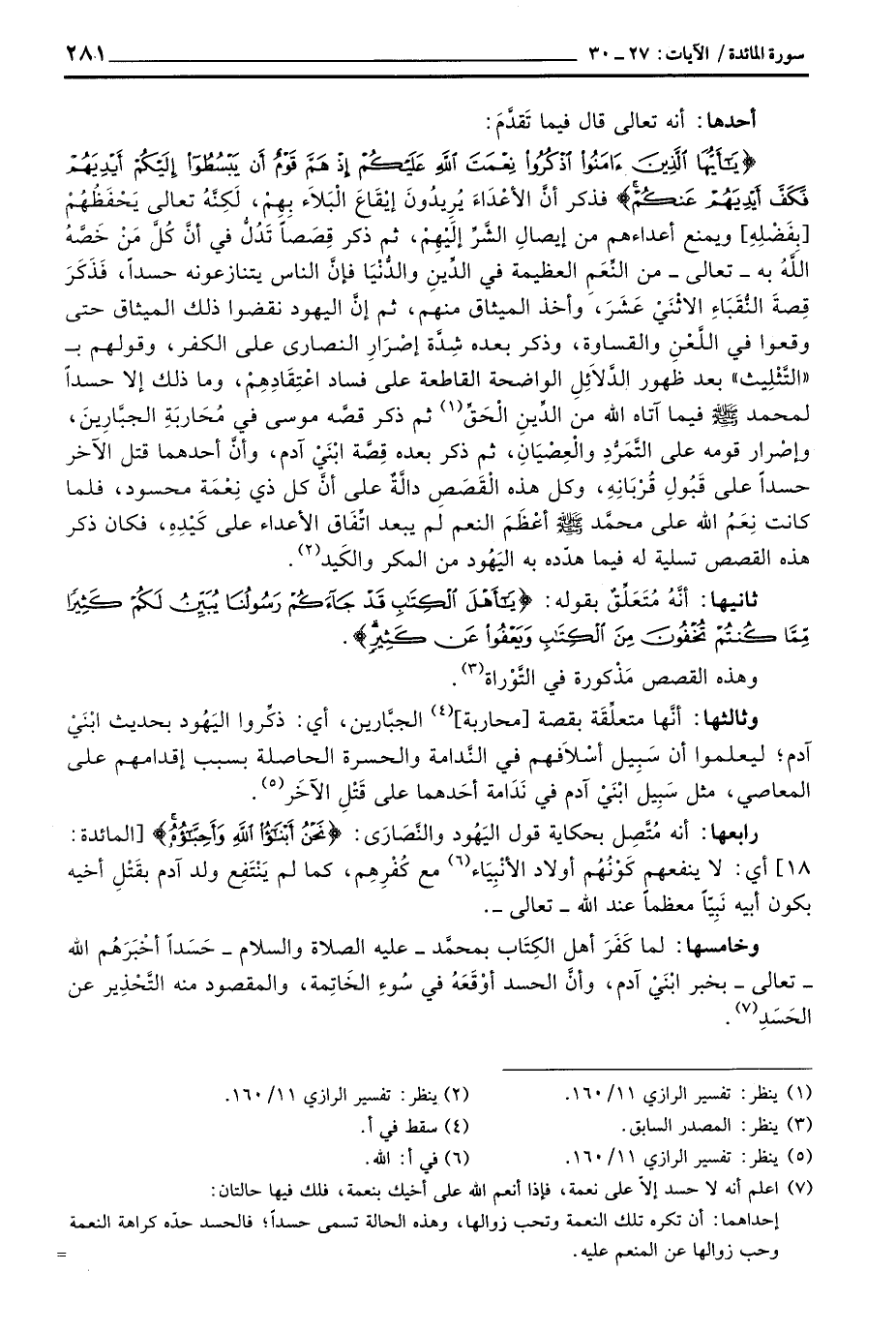 {يَا أَيُّهَآ الذين آمَنُواْ اذكروا نِعْمَةَ الله عَلَيْكُمْ إِذْ هَمَّ قَوْمٌ أَن يَبْسُطُواْ إِلَيْكُمْ أَيْدِيَهُمْ فَكَفَّ أَيْدِيَهُمْ عَنكُمْ} [المائدة: 11] فذكر أنَّ الأعْدَاءَ يُرِيدُونَ إيْقَاعَ الْبَلاَء بِهِمْ، لَكِنَّهُ تعالى يَحْفَظُهُمْ [بِفَضْلِهِ] ويمنع أعداءهم من إيصالِ الشَّرِّ إلَيْهِمْ، ثم ذكر قِصَصاً تَدُلُّ في أنَّ كُلَّ مَنْ خَصَّهُ اللَّهُ به - تعالى - من النِّعَمِ العظيمة في الدِّينِ والدُّنْيَا فإنَّ الناس يتنازعونه حسداً، فَذَكَرَ قِصةَ النُّقَبَاءِ الاثْنَيْ عَشَرَ، وأخذ الميثاق منهم، ثم إنَّ اليهود نقضوا ذلك الميثاق حتى وقعوا في اللَّعْنِ والقساوة، وذكر بعد شِدَّة إصْرَارِ النصارى على الكفر، وقولهم ب «التَّثْلِيث» بعد ظهور الدَّلاَئِل الواضحة القاطعة على فساد اعْتِقَادِهِمْ، وما ذلك إلا حسداً لمحمد صَلَّى اللَّهُ عَلَيْهِ وَسَلَّم َ فيما آتاه الله من الدِّينِ الْحَقِّ ثم ذكر قصَّة ابْنَيْ آدم، وأنَّ أحدهما قتل الآخر حسداً على قَبُولِ قُرْبَانِهِ، وكل هذه الْقَصَصِ دالَّةٌ على أنَّ كل ذي نِعْمَة محسود، فلما كانت نِعَمُ الله على محمَّد صَلَّى اللَّهُ عَلَيْهِ وَسَلَّم َ أعْظَمَ النعم لم يبعد اتِّفَاق الأعداء على كَيْدِهِ، فكان ذكر هذه القصص تسلية له فيما هدّده به اليَهُود من المكر والكَيد.
