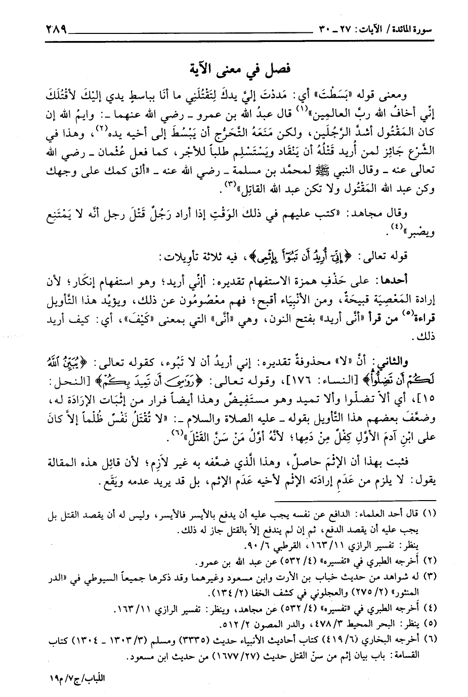 والثاني: أنَّ» لا «محذوفةٌ تقديره: إني أريدُ أن لا تَبُوء، كقوله تعالى: {يُبَيِّنُ الله لَكُمْ أَن تَضِلُّواْ} [النساء: 176] ، وقوله تعالى: {رَوَاسِيَ أَن تَمِيدَ بِكُمْ} [النحل: 15] ، أي ألاّ تضلّوا وألا تميد وهو مستَفِيضٌ وهذا أيضاً فرار من إثْبَات الإرَادَة له، وضعَّفَ بعضهم هذا التَّأويل بقوله - عَلَيْهِ الصَّلَاة وَالسَّلَام ُ -:» لا تُقْتَلُ نَفْسٌ ظُلْماً إلاَّ كانَ على ابْنِ آدمَ الأوَّلِ كِفْلٌ مِنْ دَمِها؛ لأنَّهُ أوَّلُ مَنْ سَنَّ القَتْلَ «.