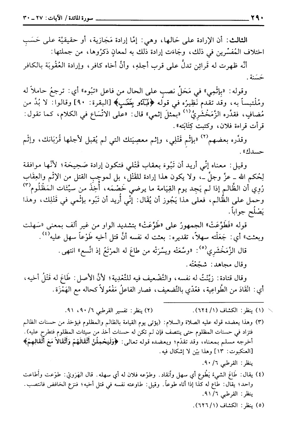 وقيل: معناه إنِّي أريد أن تَبُوءَ بعقاب قَتْلي فتكون إرادة صَحِيحَة؛ لأنَّها موافقة لِحُكم الله - عزَّ وجلَّ -، ولا يكون هذا إرادة للقَتْل، بل لموجِبِ القتل من الإثْم والعِقَاب رُوِي أن الظَّالم إذا لم يَجِد يوم القِيَامة ما يرضي خَصْمَه، أُخِذَ من سيِّئَات المَظْلُوم وحمل على الظَّالم، فعلى هذا يَجُوز أن يُقَال: إنِّي أُريد أن تَبُوء بإثْمي في قَتْلِك، وهذا يَصْلُح جواباً.