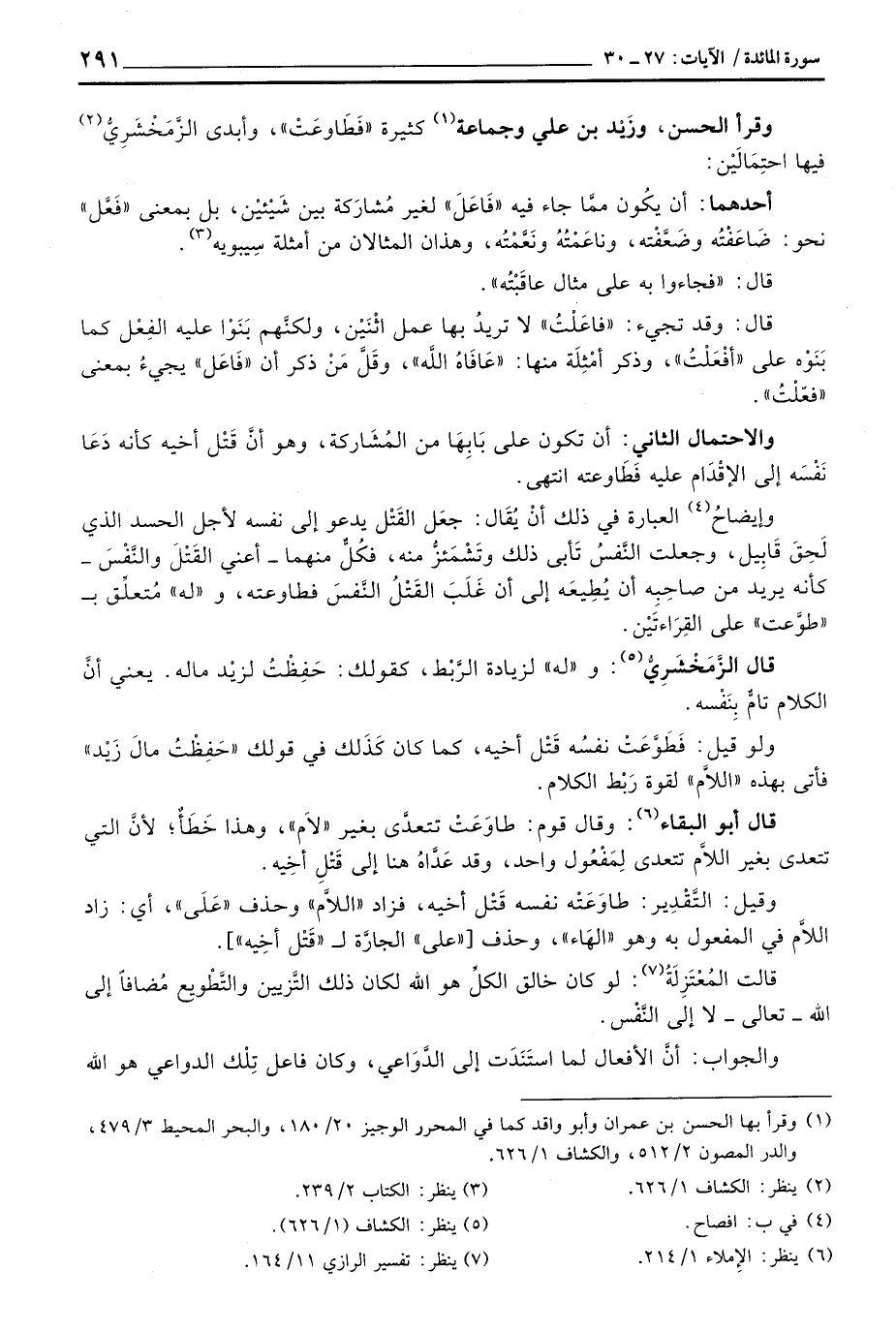 وإيضاحُ العبارة في ذلك أنْ يُقَال: جعَل القَتْل يدعو إلى نفسه لأجل الحسد الذي لَحِقَ قَابِيل، وجعلت النَّفسُ تَأبى ذلك وتَشْمَئِزُّ منه، فكُلٌّ منهما - أعني القَتْلَ والنَّفْسَ - كأنه يريد من صاحِبِه أن يُطِيعَه إلى أن غَلَبَ القَتْلُ النَّفسَ فطاوعته، و «له» مُتعلِّق ب «طوَّعت» على القِرَاءتَيْن.