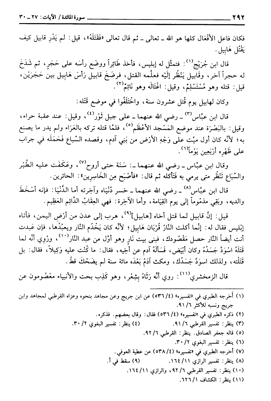 قال ابن جُرَيْج: فتمثَّل له إبليس، فأخذ طَائِراً ووضَع رأسَه على حَجَرٍ، ثم شَدَخَ له حجرًا آخر، وقَابيل يَنْظُر إلَيْه فعلَّمه القتل، فرضَخَ قابيل رَأسَ هَابِيل بين حَجَرَيْن، قيل: قتله وهو مُسْتَسْلِمٌ، وقيل: اغْتَالَه وهو نَائِمٌ.