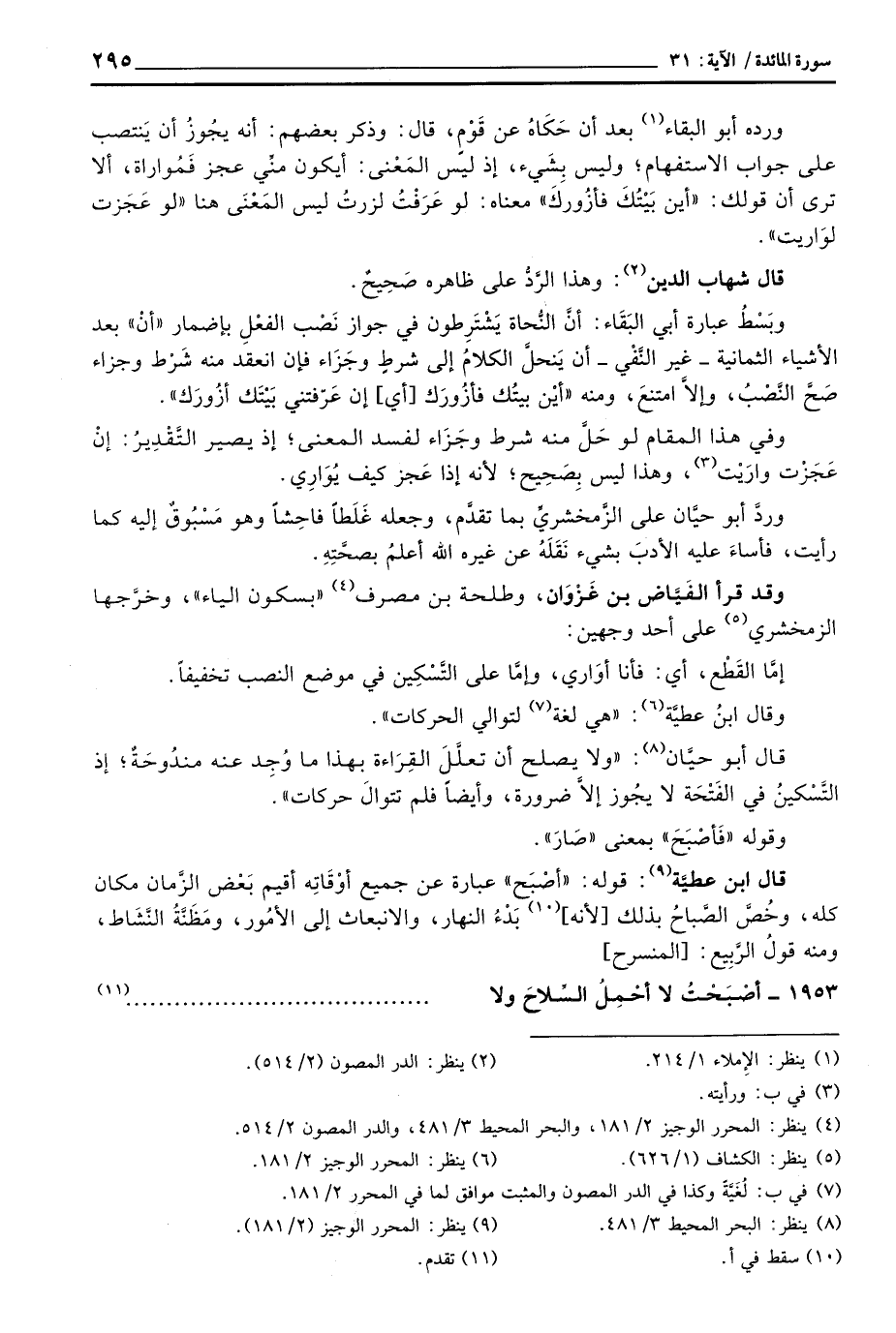 وبَسْطُ عبارة أبي البَقَاء: أنَّ النُّحاة يَشْتَرِطون في جواز نَصْب الفعْلِ بإضمار «أنْ» بعد الأشياء الثمانية - غير النَّفْي - أن يَنحلَّ الكلامُ إلى شرطٍ وجَزَاء فإن انعقد منه شَرْط وجزاء صَحَّ النَّصْبُ، وإلاَّ امتنعَ، ومنه «أيْن بيتُك فأزُورَك [أي] إن عَرّفتني بَيْتَك أزُورَك» .