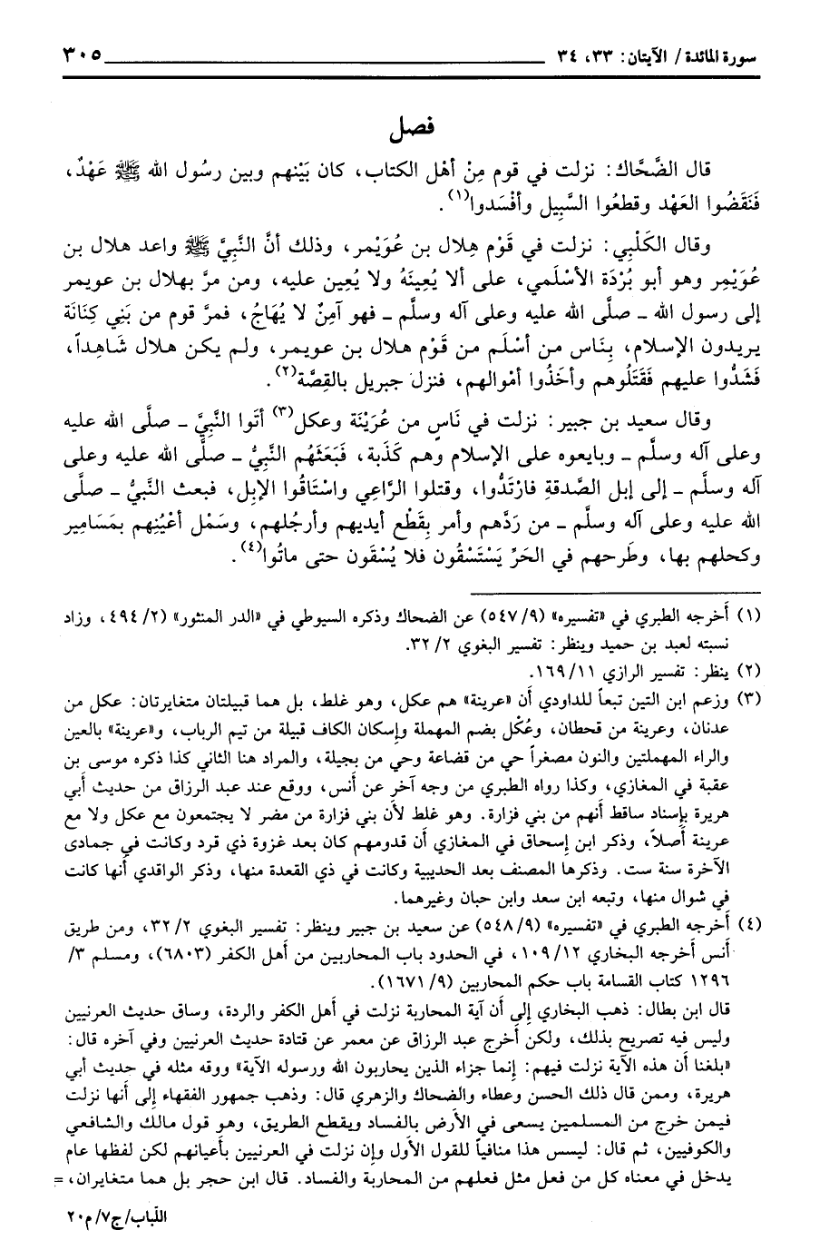 وقال سعيد بن جبير: نزلت في نَاسٍ من عُرَيْنَة وعكل أتَوا النَّبِيَّ - صلَّى الله عليه وعلى آله وسلَّم - وبايعوه على الإسلام وهم كَذَبة، فَبَعَثَهُم النَّبِيُّ - صلَّى الله عليه وعلى آله وسلَّم - إلى إبل الصَّدقةِ فارْتَدُّوا، وقتلوا الرَّاعِي واسْتَاقُوا الإبِل، فبعث النَّبيُّ - صلَّى الله عليه وعلى آله وسلَّم - من رَدَّهم وأمر بِقَطْع أيديهم وأرجُلهم، وسَمْل أعْيُنِهم بمَسَامِير وكحلهم بها، وطَرحهم في الحَرِّ يَسْتَسْقُون فلا يُسْقَون حتى ماتُوا.