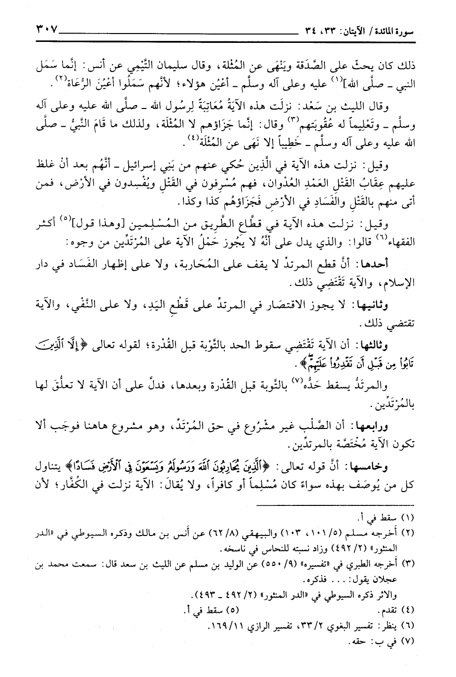 وقيل: نزلت هذه الآية في قطَّاعِ الطَّرِيق من المُسْلِمين [وهذا قول] أكثر الفقهاء قالوا: والذي يدل على أنَّهُ لا يَجُوز حَمْلُ الآية على المُرْتَدِّين من وجوه: