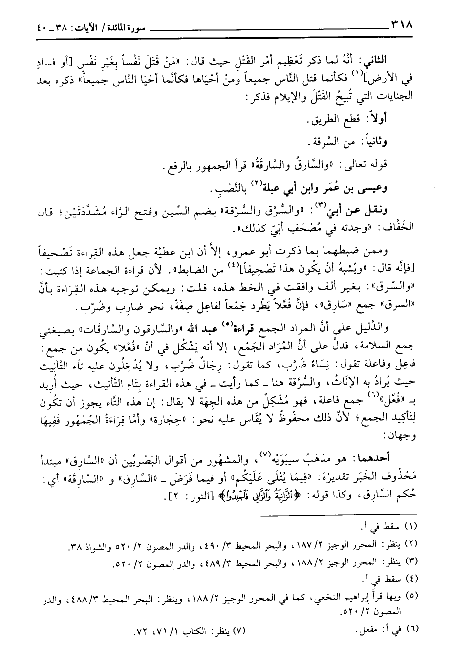 والدَّليل على أنَّ المراد الجمع قراءة عبد الله «والسَّارقون والسَّارقَات» بصيغتي جمع السلامة، فدلَّ على أنَّ المُرَاد الجَمْع، إلا أنه يَشْكُل في أنّ «فُعَّلا» يكُون من جمع: فاعِل وفاعلة تقول: نِسَاءٌ ضُرَّب، كما تقول: رِجَالٌ ضُرَّب، ولا يُدْخِلُون عليه تاء التَّأنِيث حيث يُرادُ به الإنَاثُ، والسُّرَّقة هنا - كما رأيت - في هذه القراءة بِتَاءِ التَّأنيث، حيث أُرِيد ب «فُعَّل» جمع فاعلة، فهو مُشْكِلٌ من هذه الجِهَة لا يقال: إن هذه التَّاء يجوز أن تكُون لِتَأكِيد الجمع؛ لأنَّ ذلك محفُوظٌ لا يُقَاس عليه نحو: «حِجَارة» وأمَّا قِرَاءَةُ الجُمْهُور فَفِيهَا وجهان: