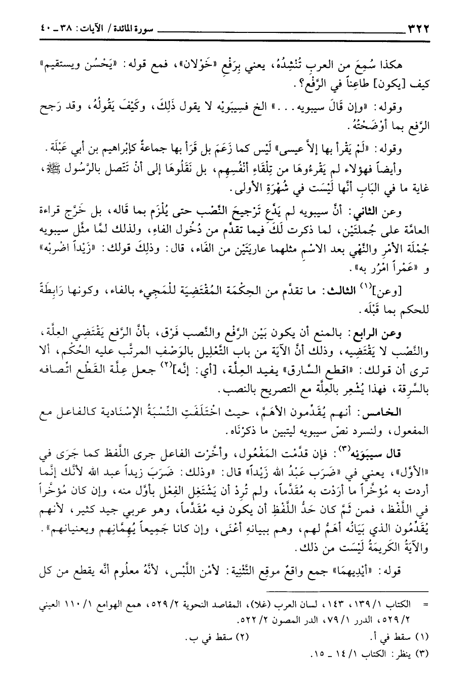 قال سيبَوَيْه: فإن قدَّمْت المَفْعُول، وأخَّرْت الفاعل جرى اللَّفظ كما جَرَى في «الأوَّل» ، يعني في «ضَرَب عَبْدُ الله زَيْداً» قال: «وذلك: ضَرَبَ زيداً عبد الله لأنَّك إنَّما أردت به مُؤخَّراً ما أرَدْت به مُقَدَّماً، ولم تُرِدْ أن يَشْتَغِل الفِعْل بأوَّل منه، وإن كان مُؤخَّراً في اللَّفْظ، فمن ثَمَّ كان حَدُّ اللَّفْظِ أن يكون فيه مُقَدَّماً، وهو عربي جيد كثير، لأنهم يُقَدِّمُون الذي بَيَانُه أهَمُّ لهم، وهم ببيانهِ أعْنَى، وإن كانا جَمِيعاً يُهِمَّانِهم ويعنيانهم» . والآيَةُ الكَريمَةُ لَيْسَت من ذلك.