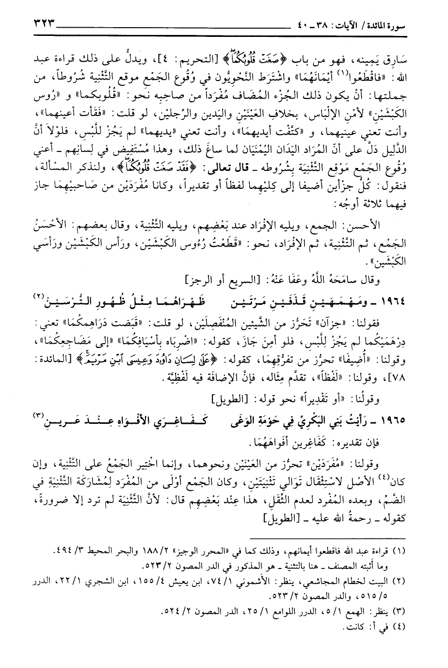 سَارِق يَمِينه، فهو من باب {صَغَتْ قُلُوبُكُمَا} [التحريم: 4] ، ويدلُّ على ذلك قراءة عبد الله: «فاقْطَعُوا أيْمَانَهُمَا» واشْتَرَط النَّحْوِيُّون في وُقُوع الجَمْعِ موقع التَّثْنِية شُرُوطاً، من جملتها: أنْ يكون ذلك الجُزْء المُضَاف مُفْرَداً من صاحِبِه نحو: «قُلُوبكما» و «رُوس الكَبْشَيْنِ» لأمْنِ الإلْبَاس، بخلافِ العَيْنَيْنِ واليَدين والرِّجليْن، لو قلت: «فَقَأت أعينهما» ، وأنت تعني عينيهما، و «كتَّفْت أيديهمَا» ، وأنت تعني «يديهما» لم يَجْزْ للَّبْسِ، فلوْلاَ أنَّ الدَّلِيل دَلَّ على أنّ المُرَاد اليَدَان اليُمْنَيَان لما ساغَ ذلك، وهذا مُسْتَفِيض في لِسانِهم - أعني وُقُوع الجَمْع مَوْقِع التَّثْنِيَة بِشُرُوطه - قال تعالى: