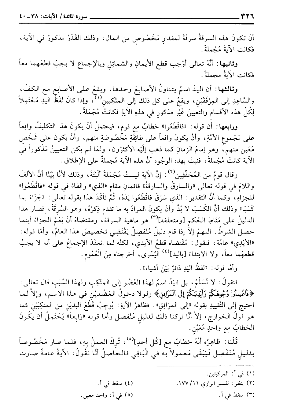 ورابعها: أن قوله: «فاقْطَعُوا» خطابٌ مع قومٍ، فيحتملُ أنْ يكونَ هذا التكليفُ واقِعاً على مَجْموعِ الأمَّةِ، وأنْ يكونَ واقعاً على طائِفَةٍ مَخْصُوصَةٍ منهم، وأنْ يكونَ على شَخْص مُعَين منهم، وهو إمامُ الزمانِ كما ذهب إلَيْه الأكثرُون، ولمّا لم يكن التعيينُ مَذْكوراً في الآية كانتْ مُجْملةً، فثبتَ بهذه الوجُوهِ أنَّ هذه الآية مُجملةٌ على الإطلاقِ.