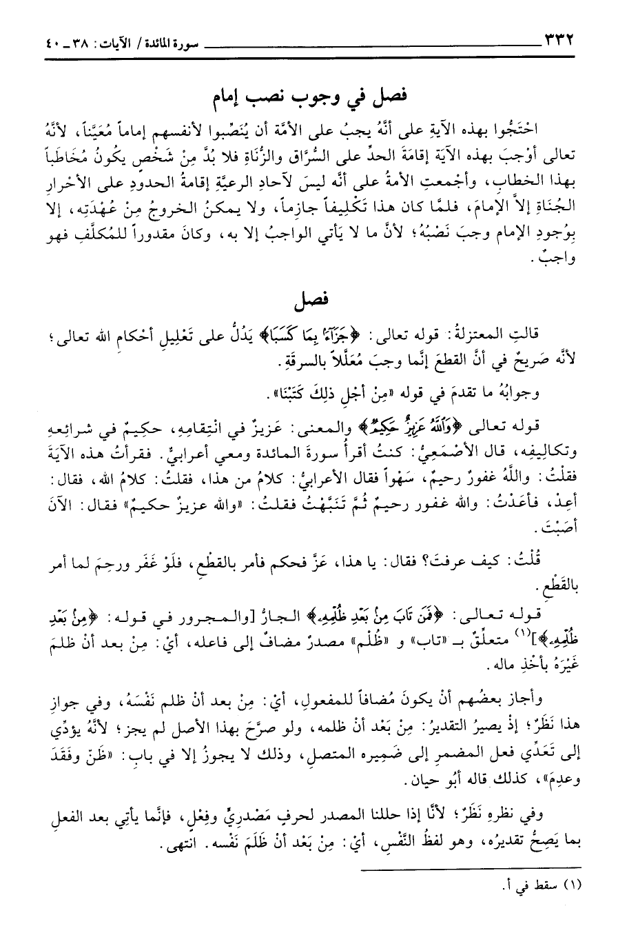احْتَجُّوا بهذه الآيةِ على أنَّهُ يجبُ على الأمَّة أن يُنَصِّبوا لأنفسهم إماماً مُعَيَّناً، لأنَّهُ تعالى أوْجبَ بهذه الآيَة إقامَةَ الحدِّ على السُّرَّاق والزُّنَاةِ فلا بُدَّ مِنْ شَخْصٍ يكُونُ مُخَاطَباً بهذا الخطابِ، وأجْمعتِ الأمةُ على أنَّه ليسَ لآحادِ الرعيَّةِ إقامةُ الحدودِ على الأحْرارِ الجُنَاةِ إلاَّ الإمامَ، فلمَّا كان هذا تَكْلِيفاً جازِماً، ولا يمكنُ الخروجُ مِنْ عُهْدَتِه، إلا بِوُجودِ وجبَ نَصْبُهُ؛ لأنَّ ما لا يَأتي الواجبُ إلا به، وكانَ مقدوراً للمُكلَّفِ فهو واجبٌ.