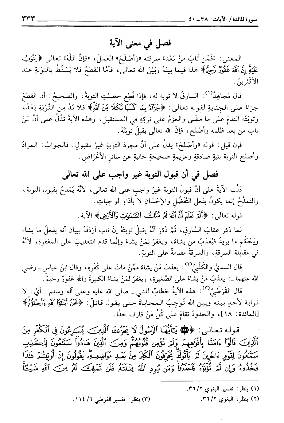 المعنى: {فَمَن تَابَ مِن بَعْدِ} سرقته «وَأصْلَحَ» العملَ، «فإنَّ اللَّهَ» تعالى {يَتُوبُ عَلَيْهِ إِنَّ الله غَفُورٌ رَّحِيمٌ} هذا فيما بينَهُ وبَيْنَ الله تعالى، فأمَّا القطعُ فلا يَسْقُطُ بالتَّوْبةِ عند الأكْثرينَ.