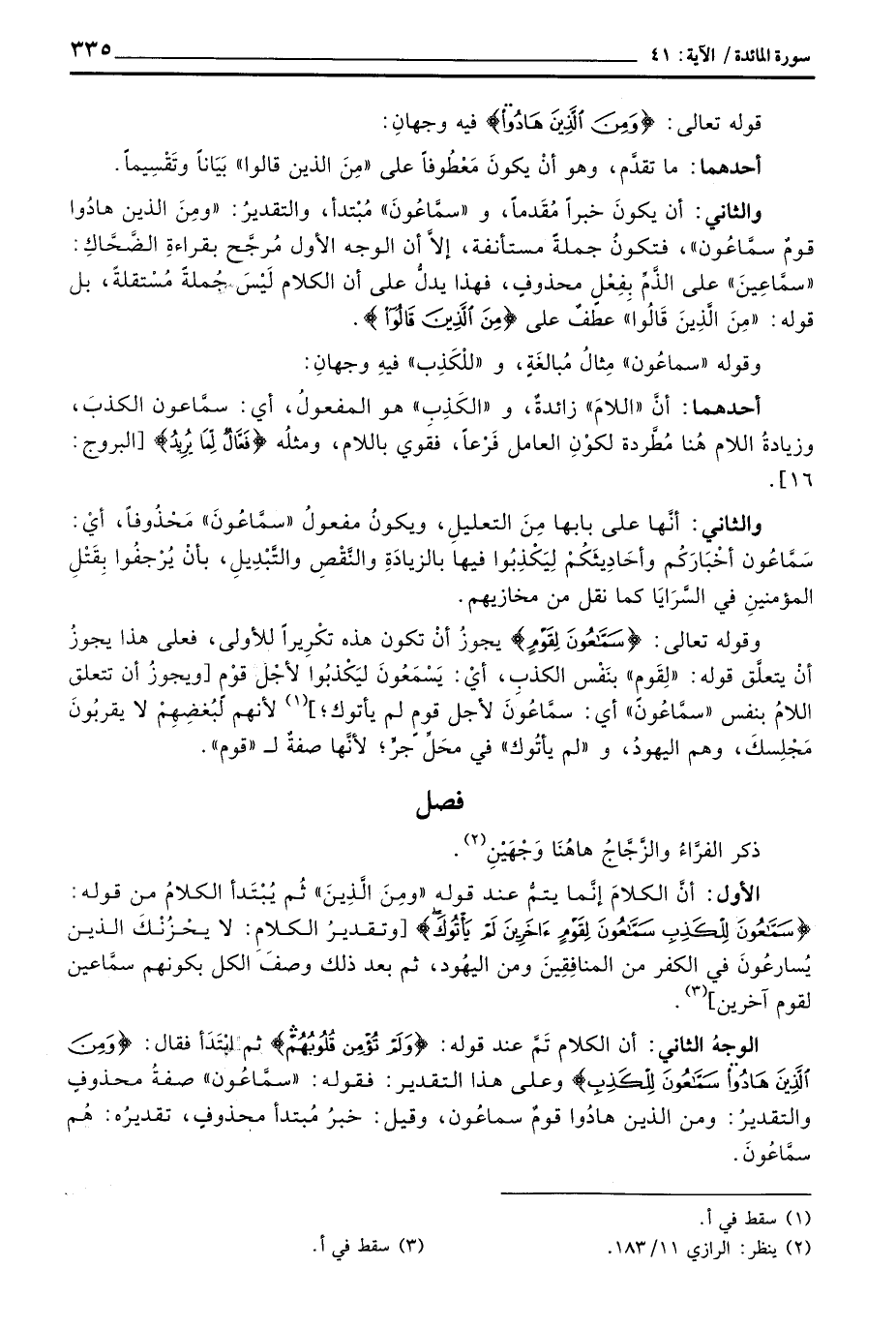 الأول: أنَّ الكلامَ إنَّما يتمُّ عند قوله «ومِنَ الَّذِينَ» ثُم يُبْتَدأ الكلامُ من قوله: {سَمَّاعُونَ لِلْكَذِبِ سَمَّاعُونَ لِقَوْمٍ آخَرِينَ لَمْ يَأْتُوكَ} [وتقديرُ الكلامِ: لا يحْزُنْكَ الذين يُسارعُونَ في الكفر من المنافِقِينَ ومن اليهُود، ثم بعد ذلك وصفَ الكل بكونهم سمَّاعين لقوم آخرين] .