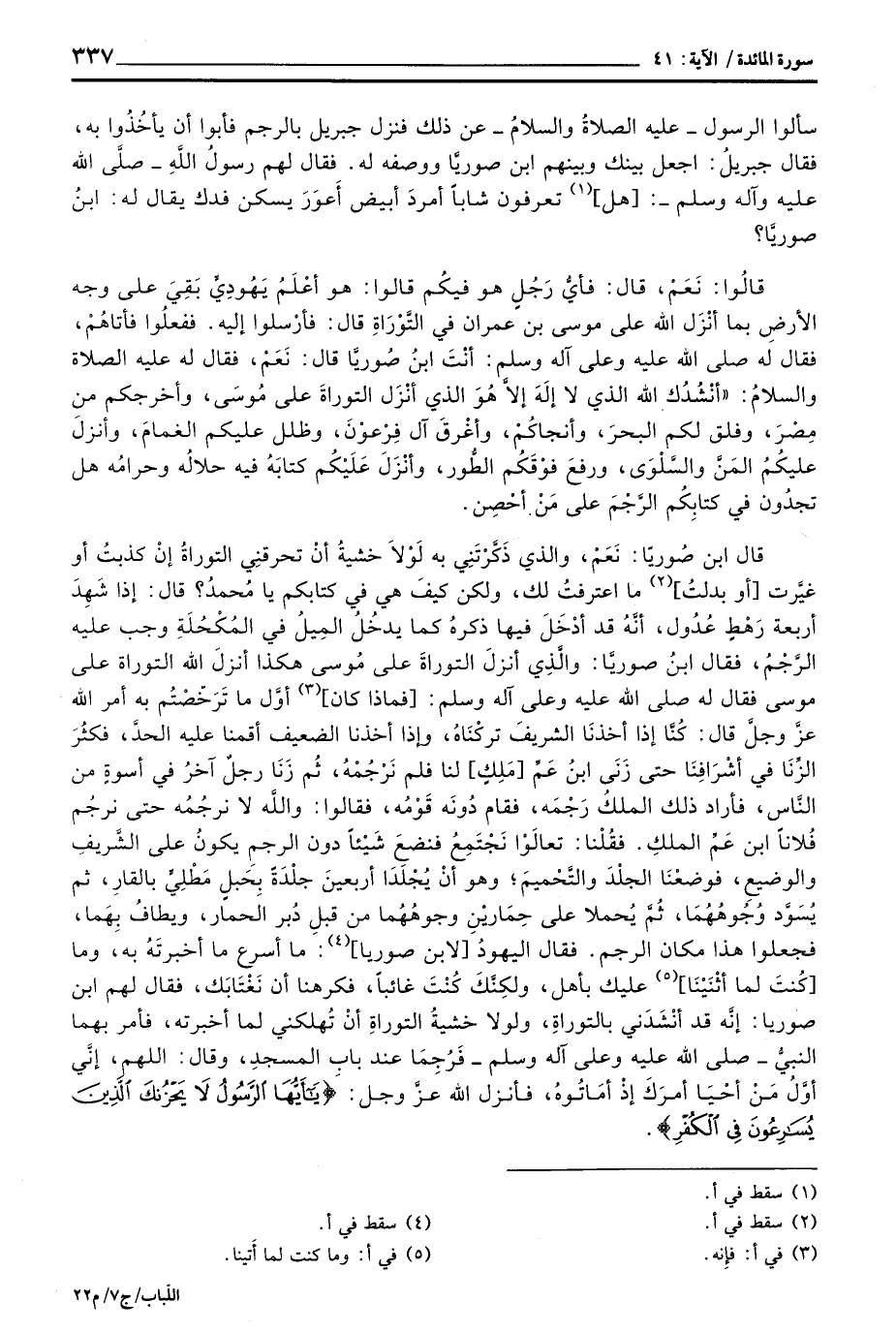 قالُوا: نَعَمْ، قال: فأيُّ رَجُلٍ هو فيكُم قالوا: هو أعْلَمُ يَهُودِيٍّ بَقِيَ على وجه الأرضِ بما أنْزَل الله على موسى بن عمران في التَّوْرَاةِ قال: فأرْسلوا إليه. ففعلُوا فأتاهُمْ، فقال له صلى الله عليه وعلى آله وسلم: أنْتَ ابنُ صُوريَّا قال: نَعَمْ، فقال له عَلَيْهِ الصَّلَاة وَالسَّلَام ُُ:» أنْشُدُك الله الذي لا إلَهَ إلاَّ هُوَ الذي أنْزَل التوراةَ على مُوسَى، وأخرجكم من مِصْرَ، وفلق لكم البحرَ، وأنجاكُمْ، وأغْرقَ آل فِرْعوْنَ، وظلل عليكم الغمامَ، وأنزلَ عليكُمُ المَنَّ والسَّلْوَى، ورفعَ فوْقَكُم الطُّور، وأنْزَلَ عَلَيْكُم كتابَهُ فيه حلالُه وحرامُه هل تجدُون في كتابِكُم الرَّجْمَ على مَنْ أحْصِن.