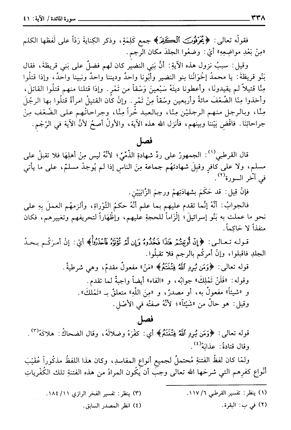 وقيل: سببُ نزول هذه الآيةِ: أنَّ بَنِي النضير كان لهم فضلٌ على بَنِي قريظةَ، فقال بَنُوا قريظةَ: يا محمدُ إخْوَانُنا بنو النضير وأبُونا واحدٌ وديننا واحدٌ ونبينا واحدٌ، وإذا قتلُوا مِنَّا قتيلاً لم يقيدونَا، وأعطونا ديتَهُ سَبْعينَ وَسْقاً من تَمْرٍ. وإذا قتلنا منهم قتلُوا القاتلَ، وأخذوا مِنّا الضِّعْفَ مائةً وأربعين وسْقاً مِنْ تَمْرٍ. وإنْ كان القتيلُ امرأةً قتلُوا بها الرجُلَ مِنَّا، وبالرجل منهم الرجليْن مِنّا، وبالعبد حُراً مِنَّا، وجراحاتُهم على الضَّعْفِ مِنْ جراحاتِنَا فاقْضِ بَيْننا وبينهم، فأنزل الله هذه الآية، والأولُ أصحُ لأنَّ الآية في الرَّجْمِ.
