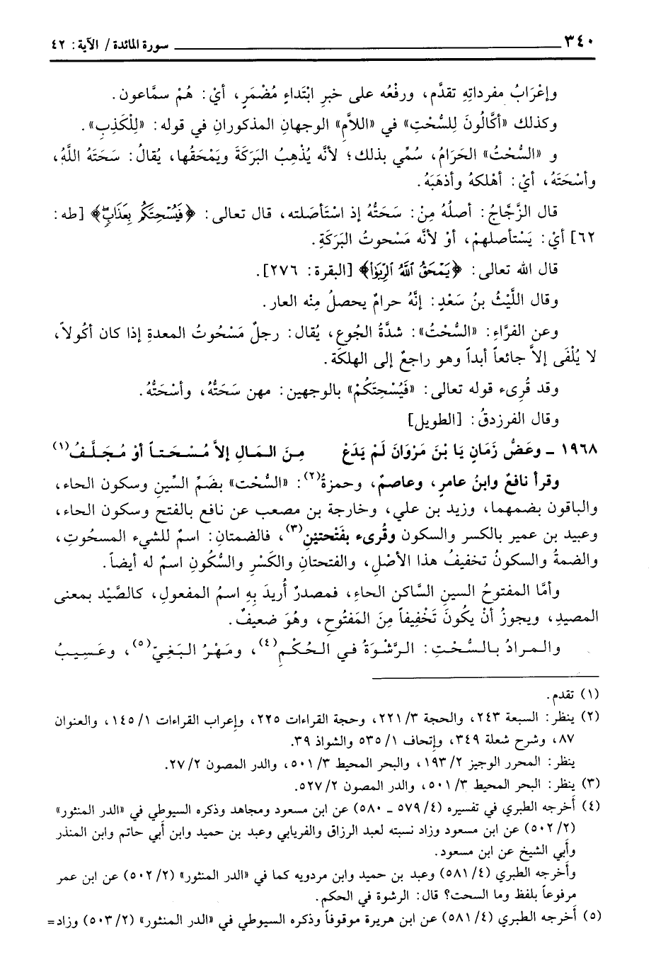 وقرأ نافعٌ وابنُ عامرٍ، وعاصمٌ، وحمزةُ: «السُّحْت» بضَمِّ السِّينِ وسكون الحاء، والباقون بضمهما، وزيد بن علي، وخارجة بن مصعب عن نافع بالفتح وسكون الحاء، وعبيد بن عمير بالكسر والسكون وقُرئ بفَتْحتيْنِ، فالضمتانِ: اسمٌ للشيء المسحُوتِ، والضمةُ والسكونُ تخفيفُ هذا الأصْلِ، والفتحتانِ والكَسْرِ والسُّكُونِ اسمٌ له أيضاً.