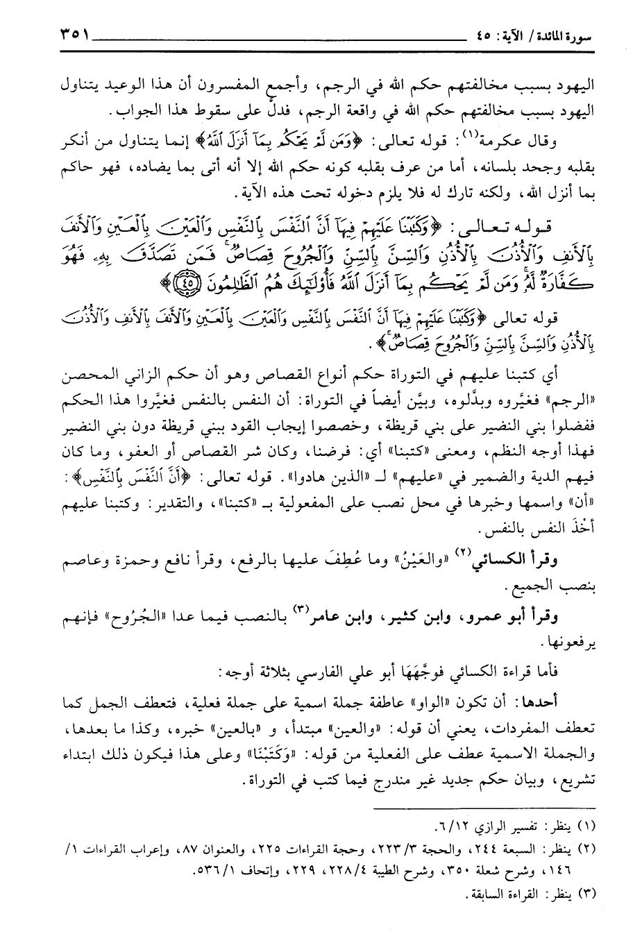 أحدها: أن تكون «الواو» عاطفة جملة اسمية على جملة فعلية، فتعطف الجمل كما تعطف المفردات، يعني أن قوله: «والعين» مبتدأ، و «بالعين» خبره، وكذا ما بعدها، والجملة الاسمية عطف على الفعلية من قوله: «وَكَتَبْنَا» وعلى هذا فيكون ذلك ابتداء تشريع، وبيان حكم جديد غير مندرج فيما كتب في التوراة.