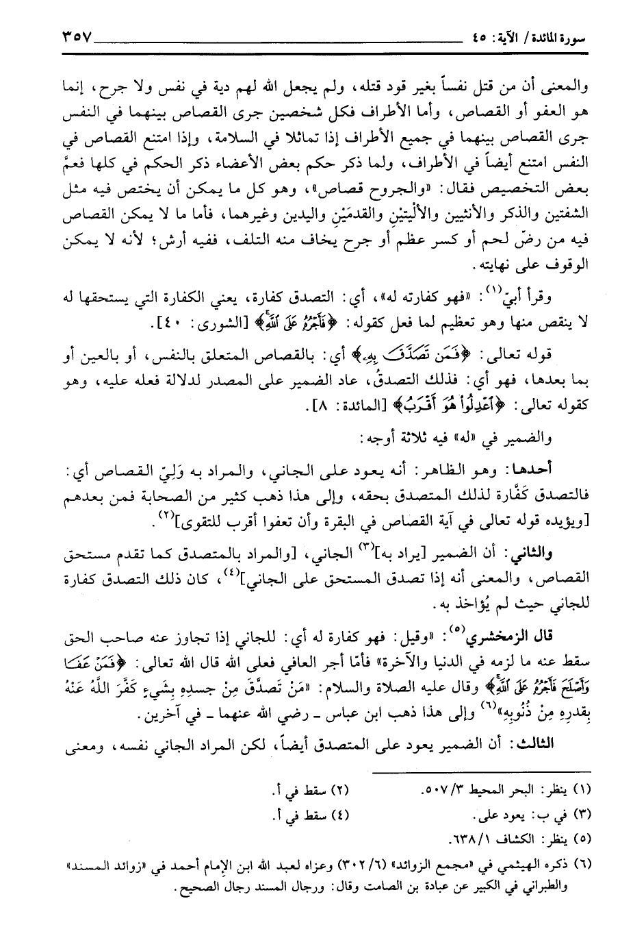 أحدها: وهو الظاهر: أنه يعود على الجاني، والمراد به وَلِيّ القصاص أي: فالتصدق كَفَّارة لذلك المتصدق بحقه، وإلى هذا ذهب كثير من الصحابة فمن بعدهم [ويؤيده قوله تعالى في آية القصاص في البقرة وأن تعفوا أقرب للتقوى] .