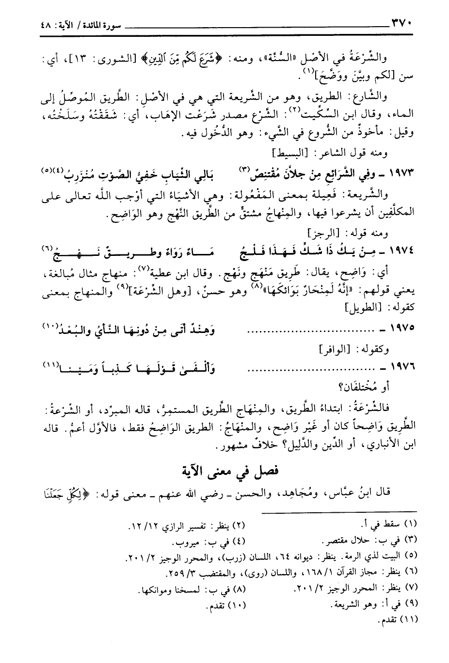 والشَّريعة: فَعِيلة بمعنى المَفْعُولة: وهي الأشيَاءُ التي أوْجب اللَّه تعالى على المكلَّفِين أن يشرعوا فيها، والمِنْهاجُ مشتقٌّ من الطَّريق النَّهْج وهو الوَاضِح.