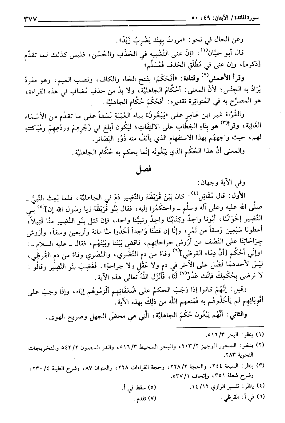 وقرأ الأعمش وقتادة: «أفَحَكَمَ» بفتح الحَاء والكاف، ونصب الميم، وهو مفردٌ يُرَادُ به الجِنْس؛ لأنَّ المعنى: أحُكَّامَ الجاهليَّة، ولا بدَّ من حذفِ مُضافٍ في هذه القراءة، هو المصرَّح به في المُتواتِرة تقديره: أفَحْكْمَ حُكَّامِ الجاهليَّة.