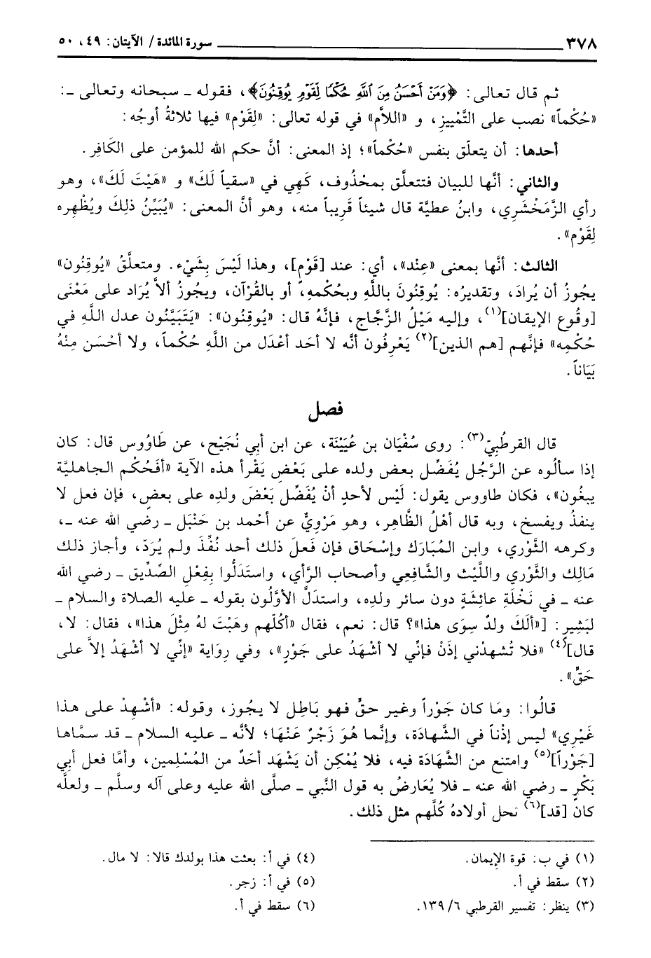 قال القرطُبِيّ: روى سُفْيَان بن عُيَيْنَة، عن ابن أبِي نُجَيْح، عن طَاوُوس قال: كان إذا سألُوه عن الرَّجُل يُفَضِّل بعض ولده على بَعْضِ يَقْرأ هذه الآية {أَفَحُكْمَ الجاهلية يَبْغُونَ} ، فكان طاووس يقول: لَيْس لأحدٍ أنْ يُفَضِّل بَعْضَ ولدِه على بعضٍ، فإن فعل لا ينفذُ ويفسخ، وبه قال أهْلُ الظَّاهِرِ، وهو مَرْوِيٌّ عن أحْمد بن حَنْبَل - رَضِيَ اللَّهُ عَنْه -، وكرهه الثَّوْري، وابن المُبَارَك وإسْحَاق فإن فَعلَ ذلك أحد نُفِّذَ ولم يُرَدّ، وأجاز ذلك مَالِك والثَّوْرِي، وابن المُبَارَك وإسْحَاق فإن فَعلَ ذلك أحد نُفِّذَ ولم يُرَدّ، وأجاز ذلك مَالِك والثَّوْرِي واللَّيْث والشَّافِعِي وأصحاب الرَّأي، واستَدَلُّوا بِفِعْلِ الصِّدِّيق - رَضِيَ اللَّهُ عَنْه - في نَخْلَةِ عائِشَةٍ دون سائر ولدِه، واستدَلَّ الأوَّلُون بقوله - عَلَيْهِ الصَّلَاة وَالسَّلَام ُ - لبَشِير: [ «ألَكَ ولد سِوَى هذا» ؟ قال: نعم، فقال «أكُلّهم وهَبْتَ لهُ مِثْلَ هذا» ، فقال: لا، قال] «فلا تُشهدْني إذَنْ فإنِّي لا أشْهَدُ على جَوْرٍ» ، وفي رِوَاية «إنِّي لا أشْهَدُ إلاَّ على حَقٍّ» .