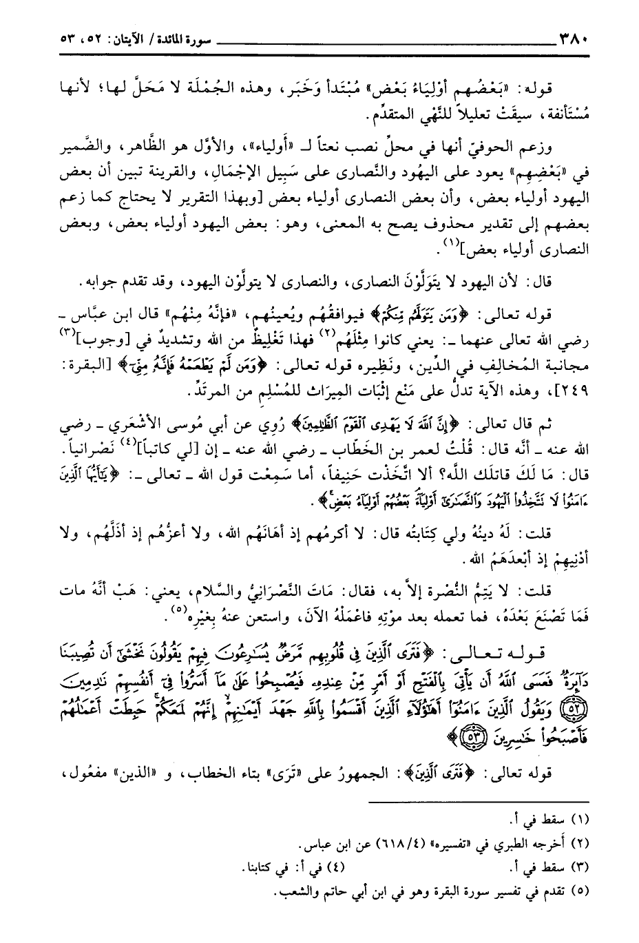 وزعم الحوفيّ أنها في محلِّ نصب نعتاً ل «أَولياء» ، والأوَّل هو الظّاهر، والضَّمير في «بَعْضِهِم» يعود على اليهُود والنَّصارى على سَبِيل الإجْمَالِ، والقرينة تبين أن بعض اليهود أولياء بعض، وأن بعض النصارى أولياء بعض [وبهذا التقرير لا يحتاج كما زعم بعضهم إلى تقدير محذوف يصح به المعنى، وهو: بعض اليهود أولياء بعض، وبعض النصارى أولياء بعض] .