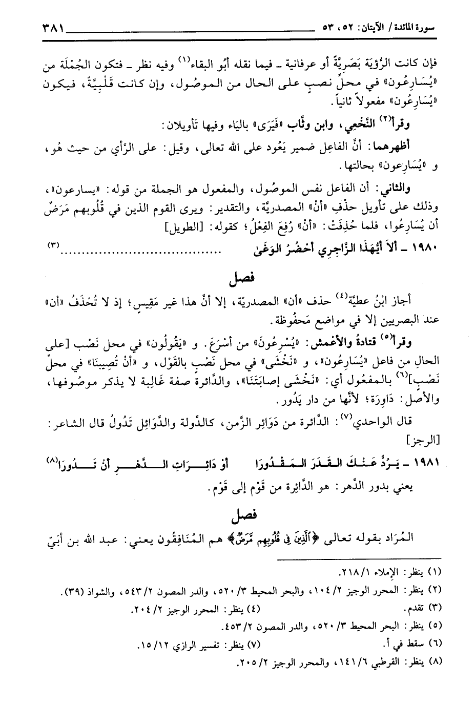والثاني: أن الفاعل نفس الموصُول، والمفعول هو الجملة من قوله: «يسارعون» ، وذلك على تأويل حذْفِ «أنْ» المصدريَّة، والتقدير: ويرى القوم الذين في قُلُوبهم مَرَضٌ أن يُسَارِعُوا، فلما حُذِفَتْ: «أنْ» رُفِعَ الفِعْلُ؛ كقوله: [الطويل]