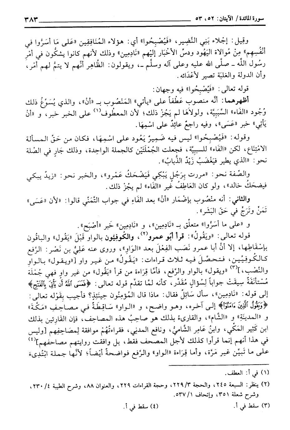 قوله تعالى: «ويَقُولُ» : قرأ أبُو عمرو، والكُوفِيُّون بالواو قَبْلَ «يَقُول» والباقُون بإسْقَاطِها، إلا أنَّ أبا عمرو نَصَب الفِعْلَ بعد «الوَاوِ» ، وروى عنه عَلِيُّ بن نَصْر: الرَّفع كالكُوفِيِّين، فتحصَّلَ فيه ثلاث قراءات: «يَقُولُ» من غير واو [ «ويقول» بالواوِ والنَّصْب،] «ويقول] بالواو والرَّفع، فأمَّا قِرَاءة من قرأ» يَقُول «من غير واوٍ فهي جُمْلَة مُسْتأنَفَةٌ سِيقَتْ جواباً لِسُؤالٍ مُقَدَّر، كأنه لمَّا تقدَّم قوله تعالى: {فَعَسَى الله أَن يَأْتِيَ بالفتح} إلى قوله» نَادِمِين «، سأل سَائِلٌ فقال: ماذا قال المُؤمِنُون حِينَئِذْ؟ فأجيب بِقَوْله تعالى: {وَيَقُولُ الذين آمَنُواْ} إلى آخره، وهو واضح، و» الواو «سَاقِطَةٌ في مصاحِفِ» مَكَّةَ «و» المدينَةِ «و» الشَّام «، والقارئُ بذلك هو صاحِبُ هذه المصاحِف، فإن القَارِئين بذلك ابن كَثِير المَكِّي، وابنُ عَامِر الشَّاميُّ، ونافع المدنِي، فقراءتُهُمْ موافقة لَمصَاحِفِهم [وليس في هذا أنهم إنما قرأوا كذلك لأجل المصحف فقط، بل وافقت روايتهم مصاحفهم] على ما تَبيَّن غير مَرَّة، وأما قِرَاءة» الواو «والرَّفع فواضحةٌ أيْضاً؛ لأنَّها جملة ابْتُدِئَ