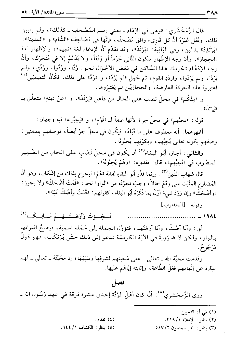 قال الزَّمَخْشَري: «وهي في الإمَام - يعني رسم المُصْحَفِ - كذلك» ، ولم يتبين ذلك، ونَقَل غَيْرُهُ أنَّ كل قَارِئ وافَق مُصْحَفَه، فإنَّها في مَصَاحِف «الشَّام» و «المدينة» : «يَرْتَدِدْ» بدالين، وفي البَاقِية: «يَرْتَدَّ» ، وقد تقدَّم أنَّ الإدغام لغة «تمِيم» ، والإظهَار لغة «الحِجاز» ، وأن وجه الإظْهَار سكون الثَّانِي جَزْماً أو وَقْفاً، ولا يُدْغَمُ إلا في مُتَحَرِّك، وأنَّ وجه الإدْغَام تحْرِيك هذا السَّاكن في بَعْضِ الأحْوَال نحو: رُدَّا، ورُدُّوا، ورُدِّي، ولم يَرُدَّا، ولم يَرُدُّوا، واردُدِ القوم، ثم حُمِل «لم يَرُدَّ» ، و «رُدَّ» على ذلك، فَكَأنَّ التَميميّين اعتبروا هذه الحركة العارضة، والحِجازيِّين لم يَعْتَبِرُوها.