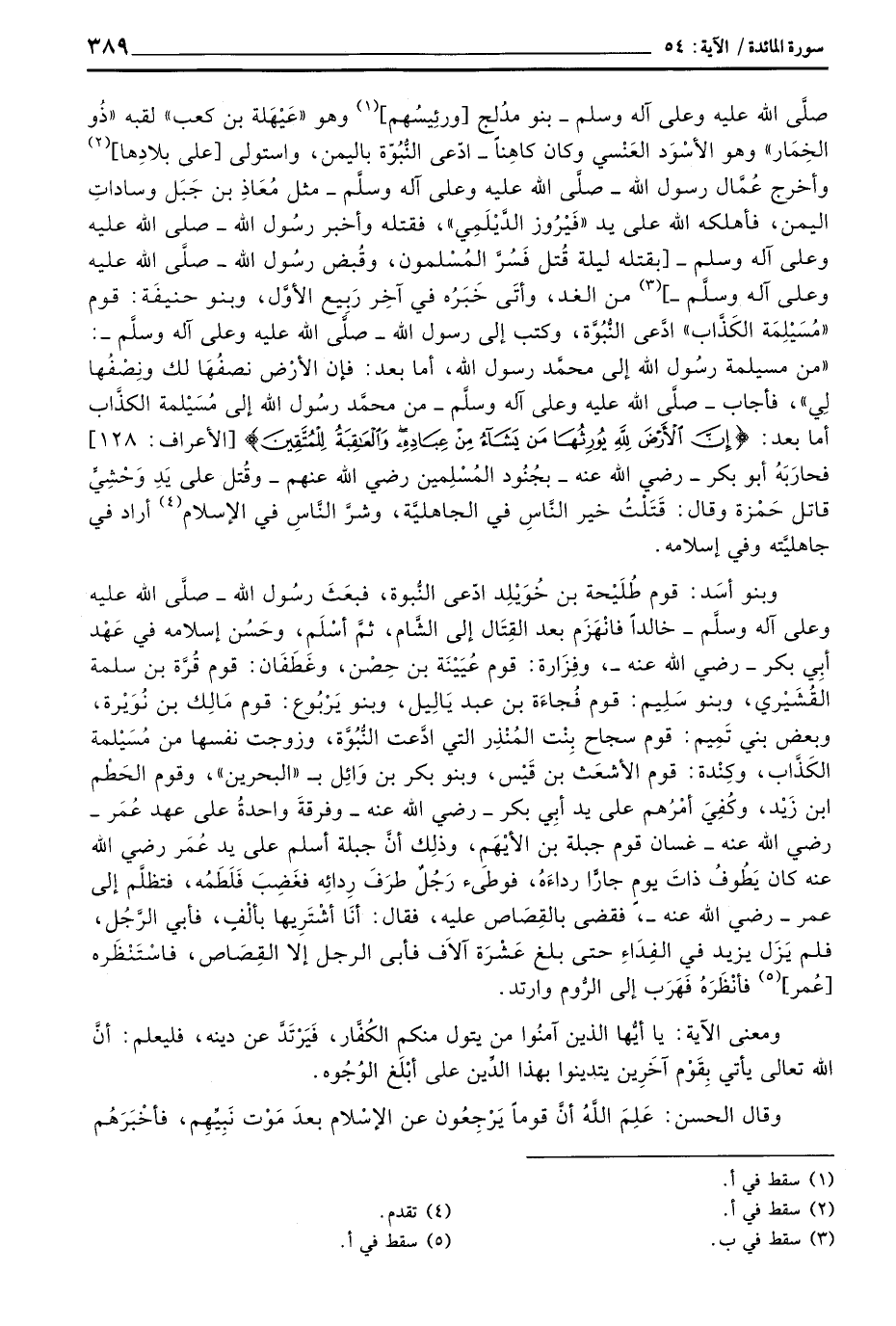 وبنو أسَد: قوم طُلَيْحة بن خُوَيْلِد ادّعى النُّبوة، فبعَثَ رسُول الله - صلَّى الله عليه وعلى آله وسلَّم - خالداً فانْهَزَم بعد القِتَال إلى الشَّام، ثمَّ أسْلَم، وحَسُن إسلامه في عَهْد أبِي بكر - رَضِيَ اللَّهُ عَنْه -، وفِزَارة: قوم عُيَيْنَة بن حِصْن، وغَطَفَان: قوم قُرَّة بن سلمة القُشَيْري، وبنو سَلِيم: قوم فُجاءَة بن عبد يَالِيل، وبنو يَرْبُوع: قوم مَالِك بن نُوَيْرة، وبعض بني تَمِيم: قوم سجاح بِنْت المُنْذِر التي ادَّعت النُّبُوَّة، وزوجت نفسها من مُسَيْلمة الكَذَّاب، وكِنْدة: قوم الأشعَث بن قَيْس، وبنو بكر بن وَائِل ب «البحرين» ، وقوم الحَطْم ابن زَيْد، وكُفِيَ أمْرُهم على يد أبِي بكر - رَضِيَ اللَّهُ عَنْه - وفرقةَ واحدةُ على عهد عُمَر - رَضِيَ اللَّهُ عَنْه - غسان قوم جبلة بن الأيْهَمِ، وذلِك أنَّ جبلة أسلم على يد عُمَر رَضِيَ اللَّهُ عَنْه كان يَطُوفُ ذاتَ يومٍ جارًّا رداءَهُ، فوطئ رَجُلٌ طرَفَ رِدائِه فغَضِبَ فَلَطَمُه، فتظلَّم إلى عمر - رَضِيَ اللَّهُ عَنْه -، فقضى بالقِصَاص عليه، فقال: أنّا أشْتَرِيها بألْفٍ، فأبي الرَّجُل، فلم يَزَل يزيد في الفِدَاءِ حتى بلغ عَشْرَة آلاَف فأبى الرجل إلا القِصَاص، فاسْتَنْظَره [عُمر] فأنْظَرَهُ فَهَرَب إلى الرُّوم وارتد.