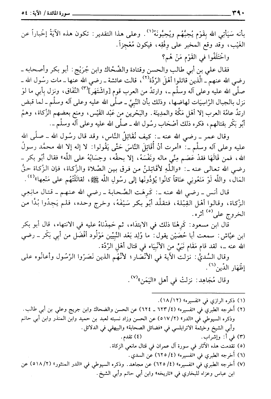فقال علي بن أبي طالب والحسن وقتادة والضَّحَّاك وابن جُرَيْج: أبو بكر وأصحابه - رَضِيَ اللَّهُ عَنْهم - الَّذين قاتلوا أهْلَ الرِّدَّة، قالت عائشة - رَضِيَ اللَّهُ عَنْها - مات رسُول الله - صلَّى الله عليه وعلى آله وسلَّم -، وارتدَّ من العرب قوم [واشْتَهَر] النِّفَاق، ونزل بِأبي ما لوْ نزل بالجبال الرَّاسِيَات لهاضها، وذلك بأن النَّبِيَّ - صلَّى الله عليه وعلى آله وسلَّم - لما قبض ارتدَّ عامَّة العرب إلا أهْل مَكَّة والمدِينَة. والبَحْرين من عَبْد القَيْس، ومنع بعضهم الزَّكاة، وهمَّ أبُو بَكْر بقتالهم، فكره ذلك أصْحَاب رسُول الله - صلَّى الله عليه وعلى آله وسلَّم -.
