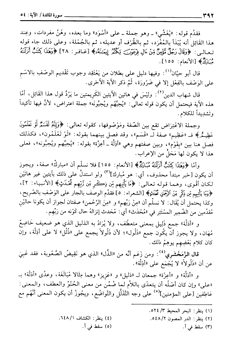 قال شهاب الدين: وليْسَ في هاتين الآيتين الكَرِيمتين ما يَرُدُّ قول هذا القَائِل، أمَّا هذه الآية فيحتمل أن يكون قوله تعالى: «يُحِبُّهُم ويُحِبُّونَه» جملة اعتراض، لأنَّ فيها تأكيداً وتَشدِيداً للكلام.