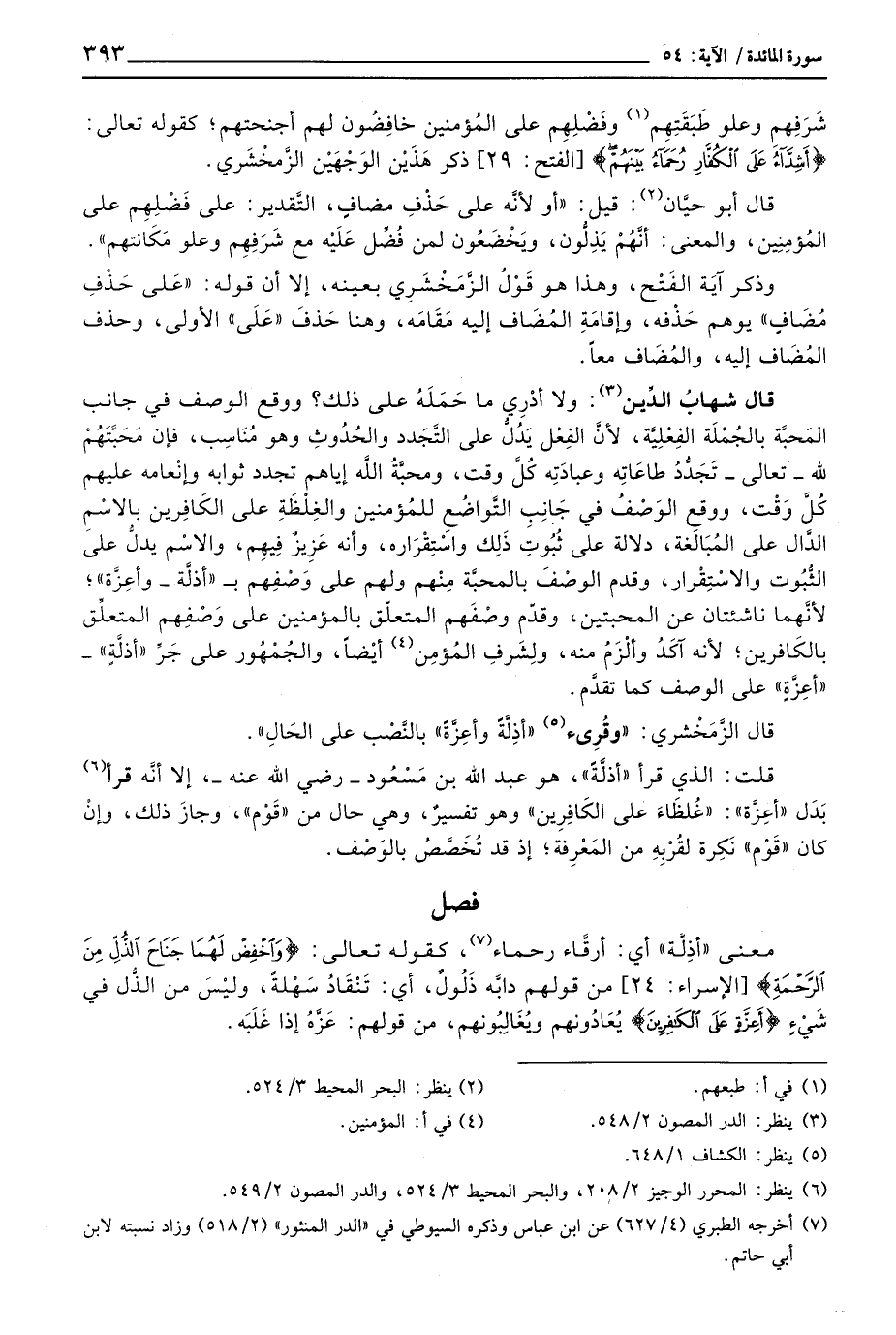 قال شهابُ الدِّين: ولا أدْرِي ما حَمَلَهُ على ذلك؟ ووقع الوصف في جانب المَحبَّة بالجُمْلَة الفِعْلِيَّة، لأنَّ الفِعْل يَدُلُّ على التَّجَدد والحُدُوثِ وهو مُنَاسِب، فإن مَحَبَّتَهُمْ لله - تعالى - تَجَدُّدُ طاعَاتِه وعبادَتِه كُلَّ وقت، ومحبَّةُ اللَّه إياهم تجد ثوابه وإنْعامه عليهم كُلَّ وَقْت، ووقع الوَصْفُ في جَانِبِ التَّواضُع للمُؤمنين والغِلْظَةِ على الكَافِرين بالاسْمِ الدَّال على المُبَالَغة، دلالة على ثُبُوتِ ذَلِك واسْتِقْرَاره، وأنه عَزِيزٌ فِيهِم، والاسْم يدلُّ على الثُّبُوت والاسْتِقْرار، وقدم الوصْفَ بالمحبَّة مِنْهم المتعلّق بالمؤمنين على وَصْفِهم المتعلِّق بالكَافرين؛ لأنه آكَدُ وألْزَمُ منه، ولِشَرفِ المُؤمِن أيْضاً، والجُمْهُور على جَرِّ «أذلَّةٍ» - «أعِزَّةٍ» على الوصف كما تقدَّم.